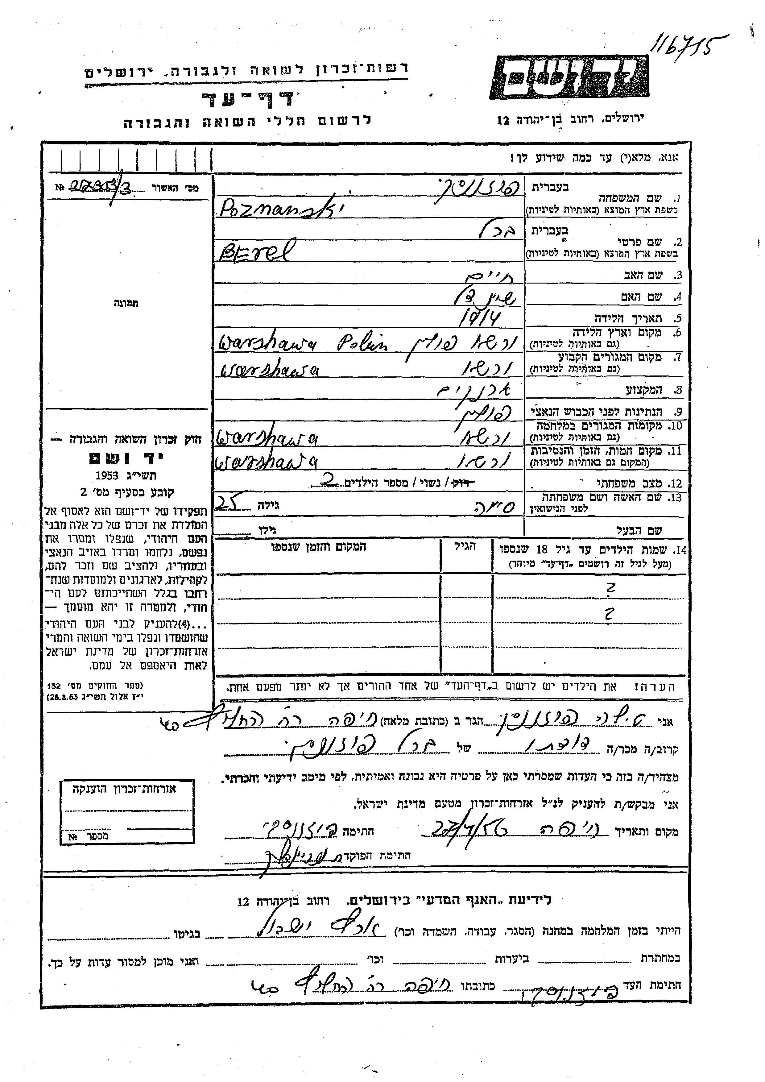 Poznanski Berl 1914 Warsaw, Poland Page of Testimony