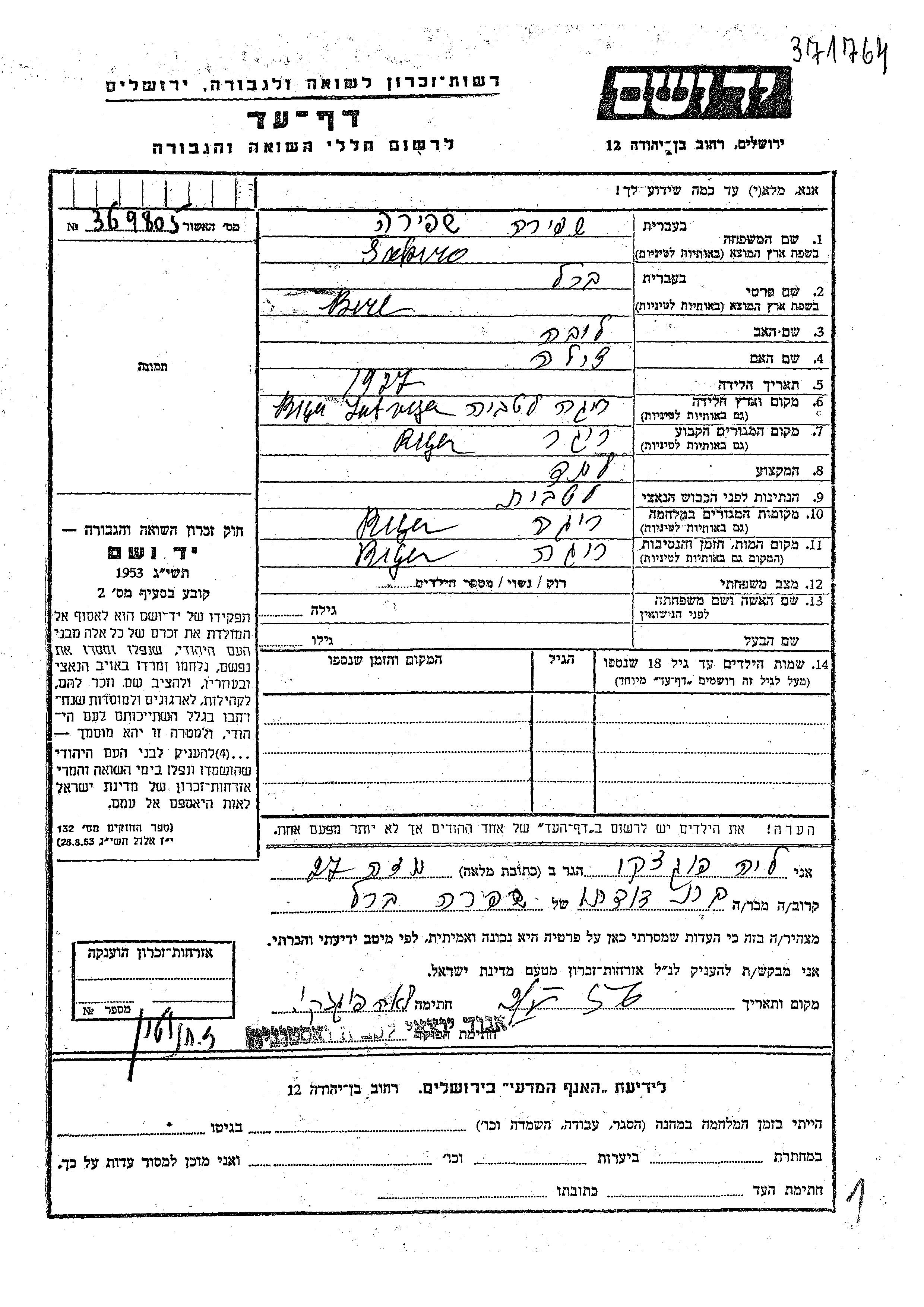 Birl Sapiro was born in Riga, Latvia, 1927 to Lova and Tzila. He was a pupil. Prior to WWII he lived in Riga, Latvia. During the war he was in Riga, Latvia. Birl was murdered in the Shoah. Place of death: Riga, Latvia.