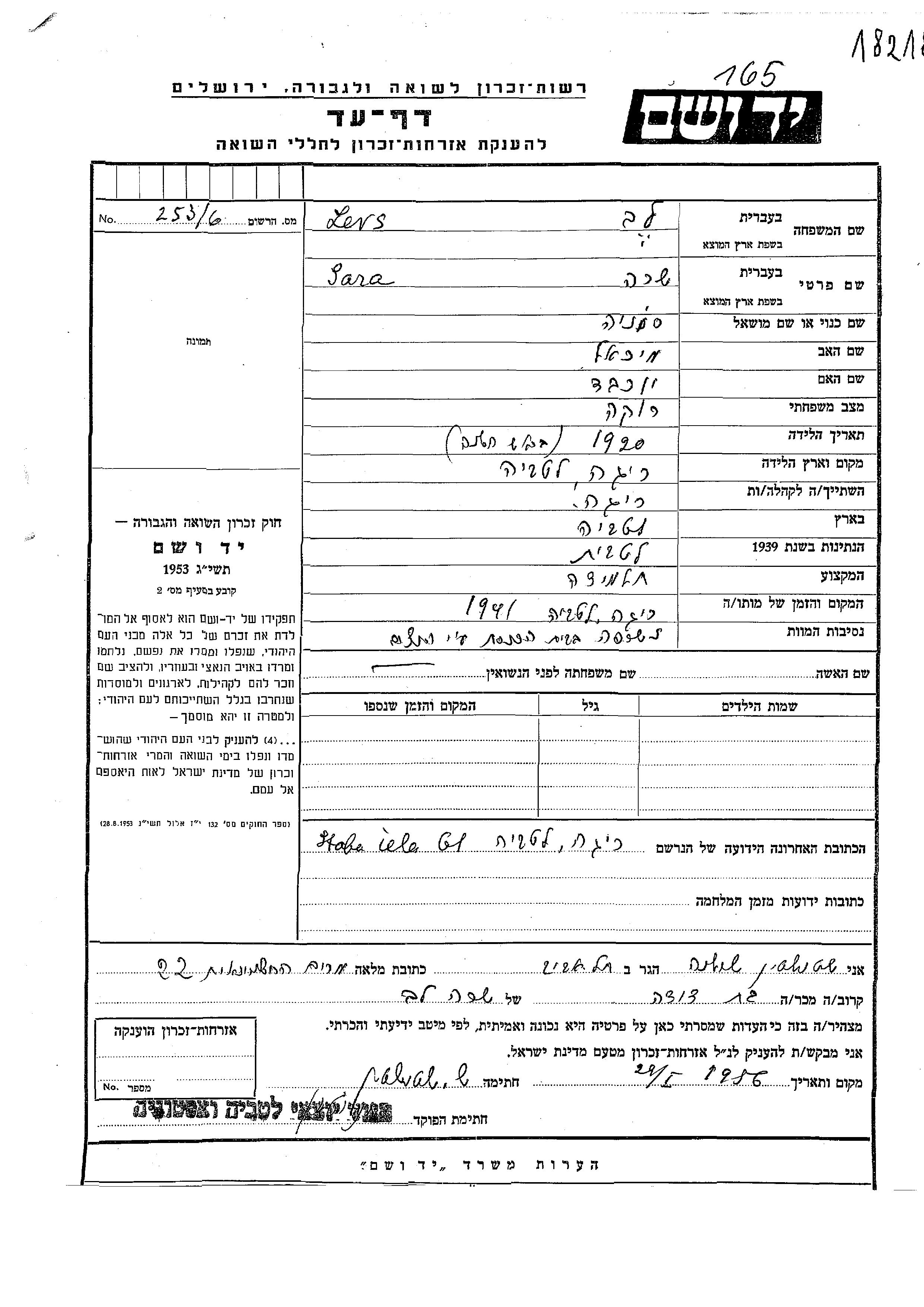 Sara Levs was born in Riga, Latvia, 1920 to Mikhael and Yokheved. She was a pupil and single. During the war she was in Riga, Latvia. Sara was murdered in the Shoah. Place of death: Riga, Latvia, 1941.
