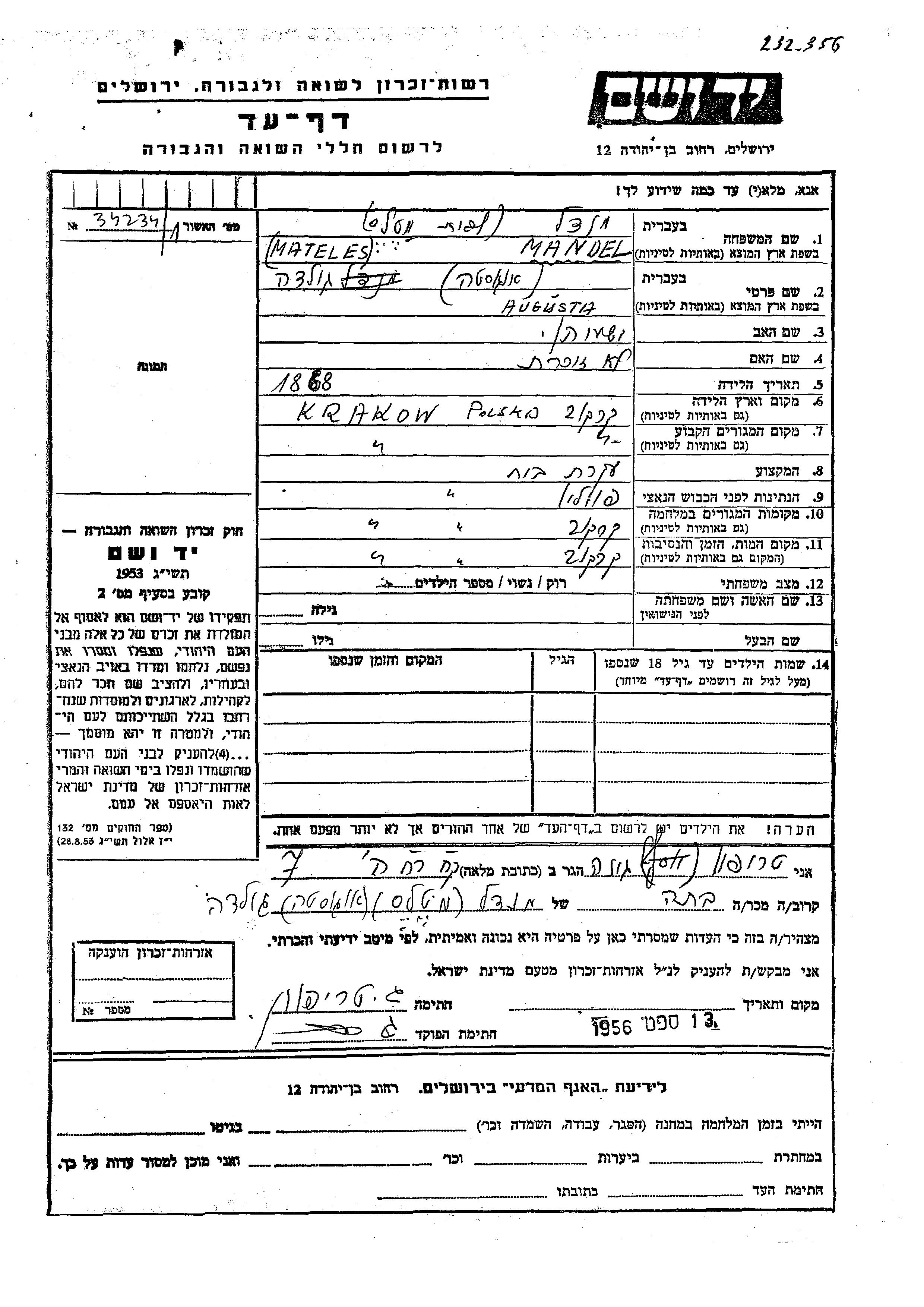 Golda Augusta Mandel nee Mateles was born in Krakow, Poland, 1868 to Yeshayahu. She was a housewife and married. Prior to WWII she lived in Krakow, Poland. During the war she was in Krakow, Poland. Golda Augusta was murdered in the Shoah. Place of death: Krakow, Poland.