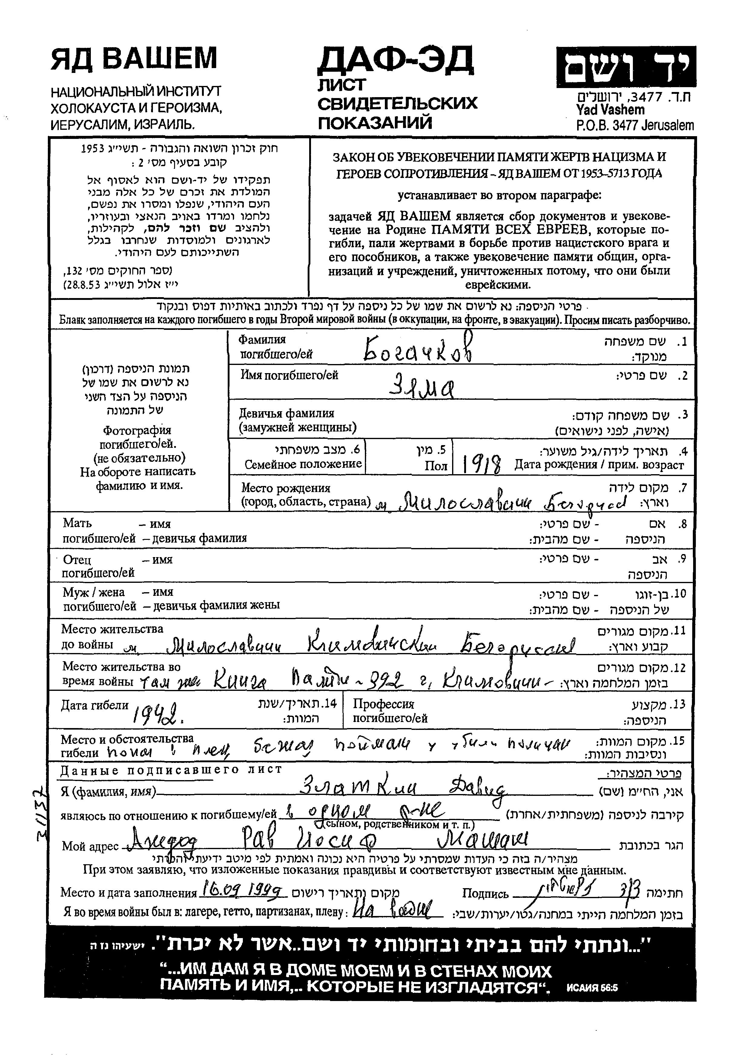 Zyama Bogachkov was born in Miloslavichi, Belorussia (USSR), 1918. Prior to WWII he lived in Miloslavichi, Belorussia (USSR). During the war he was in Miloslavichi, Belorussia (USSR). Zyama was murdered in the Shoah. Place of death: Miloslavichi, Belorussia (USSR), 1942.