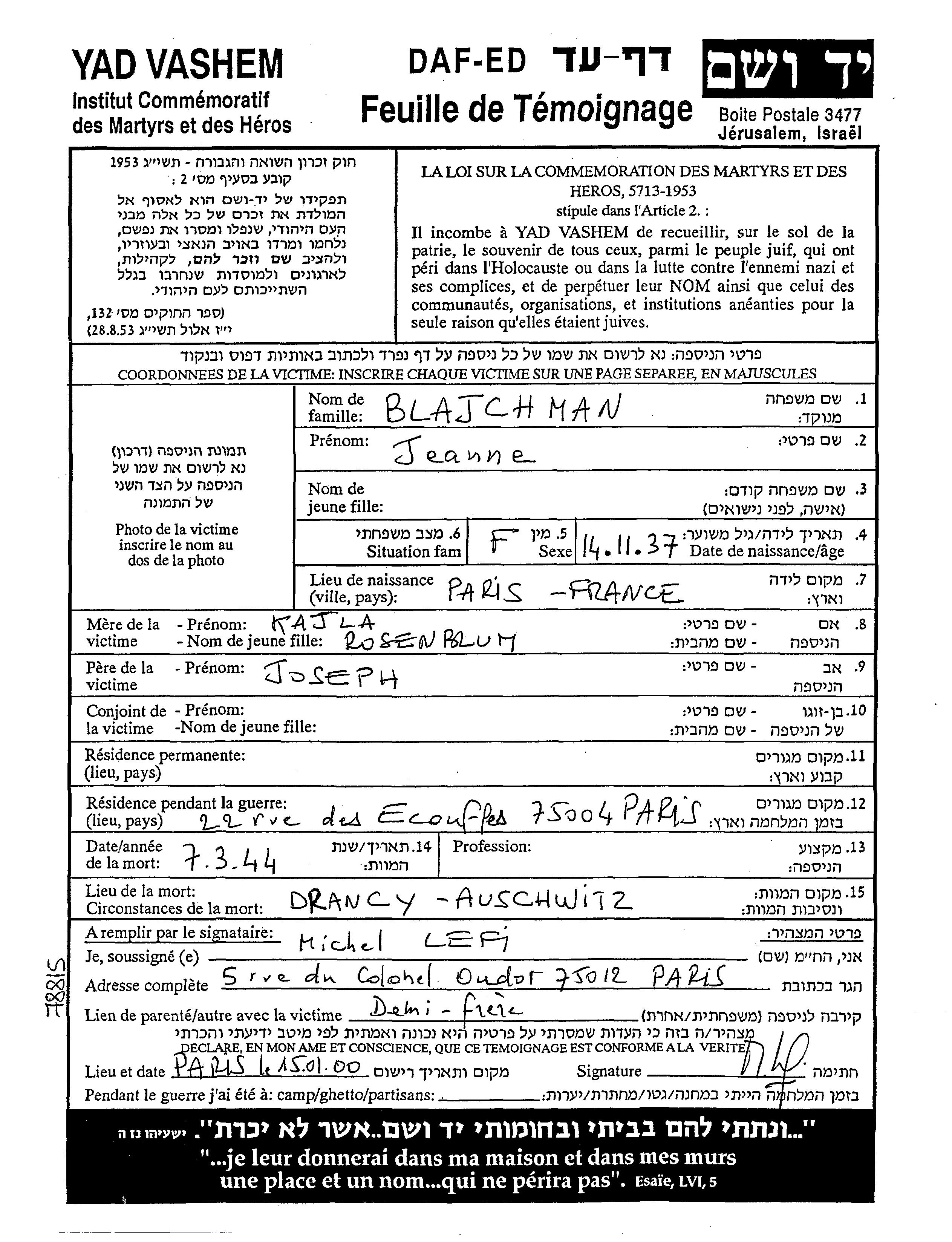 Jeanne Blajchman was born in Paris, France, 1937 to Joseph and Kajla. She was child. During the war she was in Paris, France. Jeanne was murdered in the Shoah. Place of death: Auschwitz, Poland, 1944.
