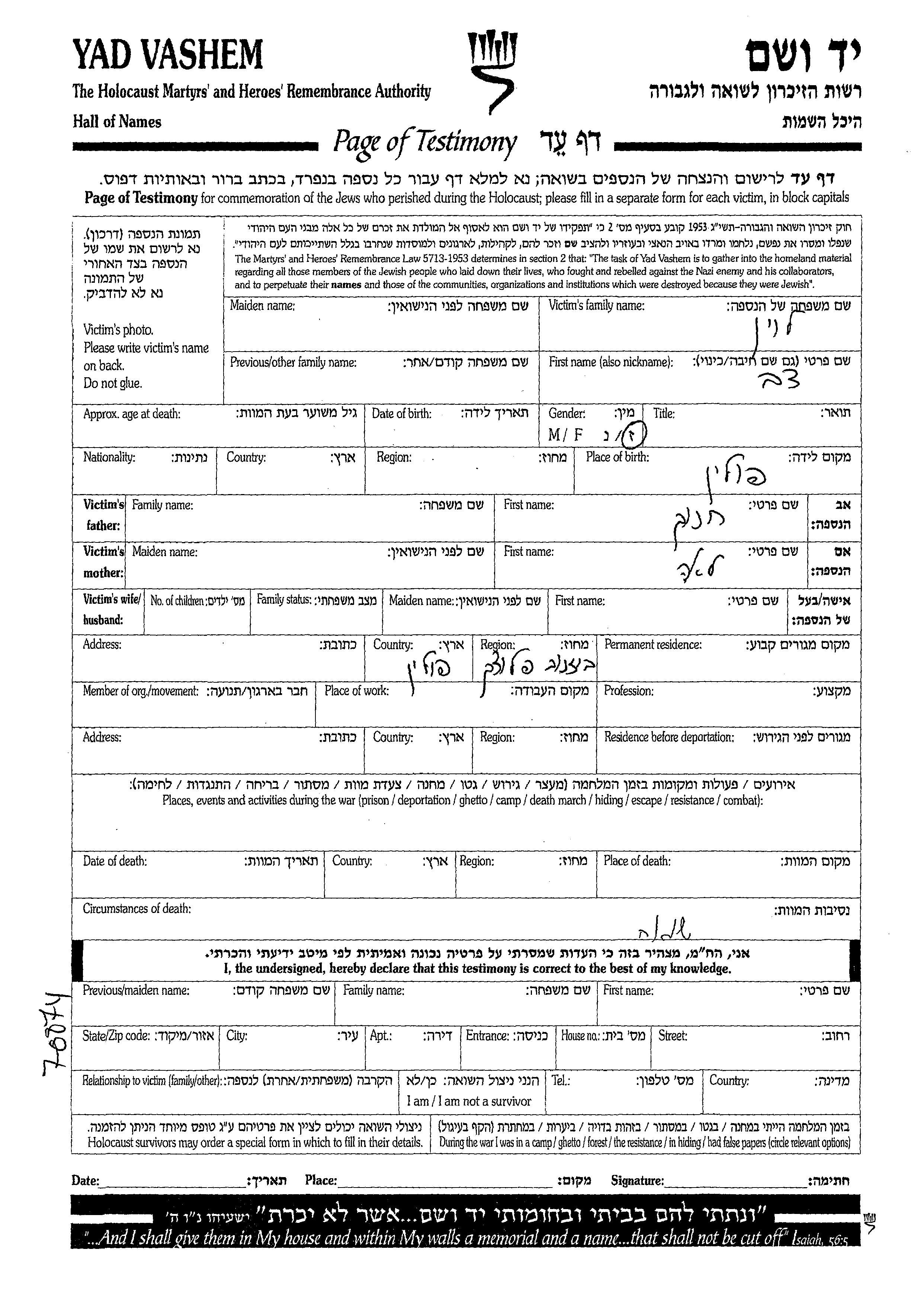 Yad Vashem - Pages of Testimony Names Memorial Collection