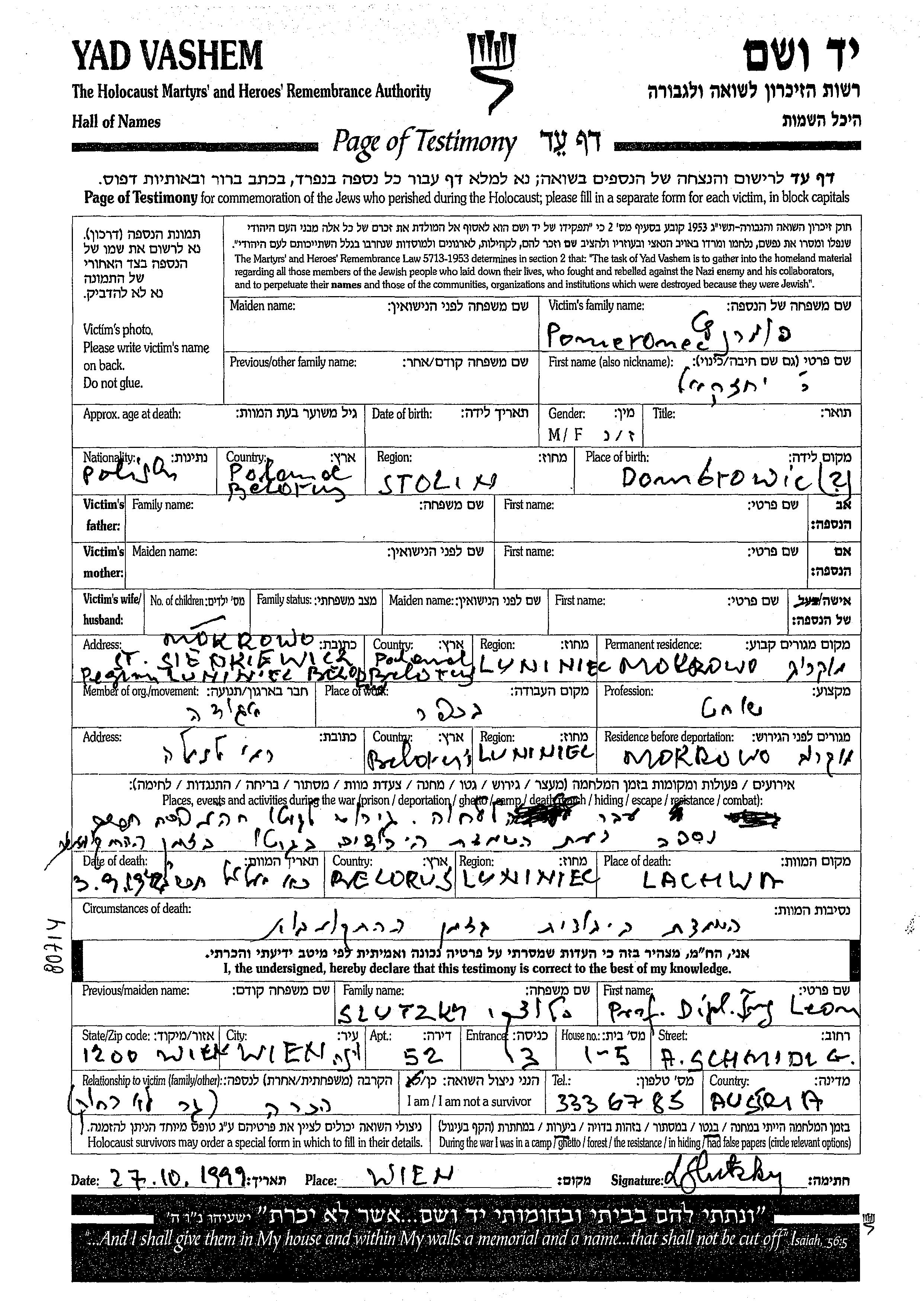 Yekhezkel Pomeranec was born in Dabrowice, Poland. He was a ritual slaughterer. Prior to WWII he lived in Mokrowo, Poland. During the war he was in Mokrowo, Poland. Yekhezkel was murdered in the Shoah. Place of death: Lachwa, Poland, 1942.