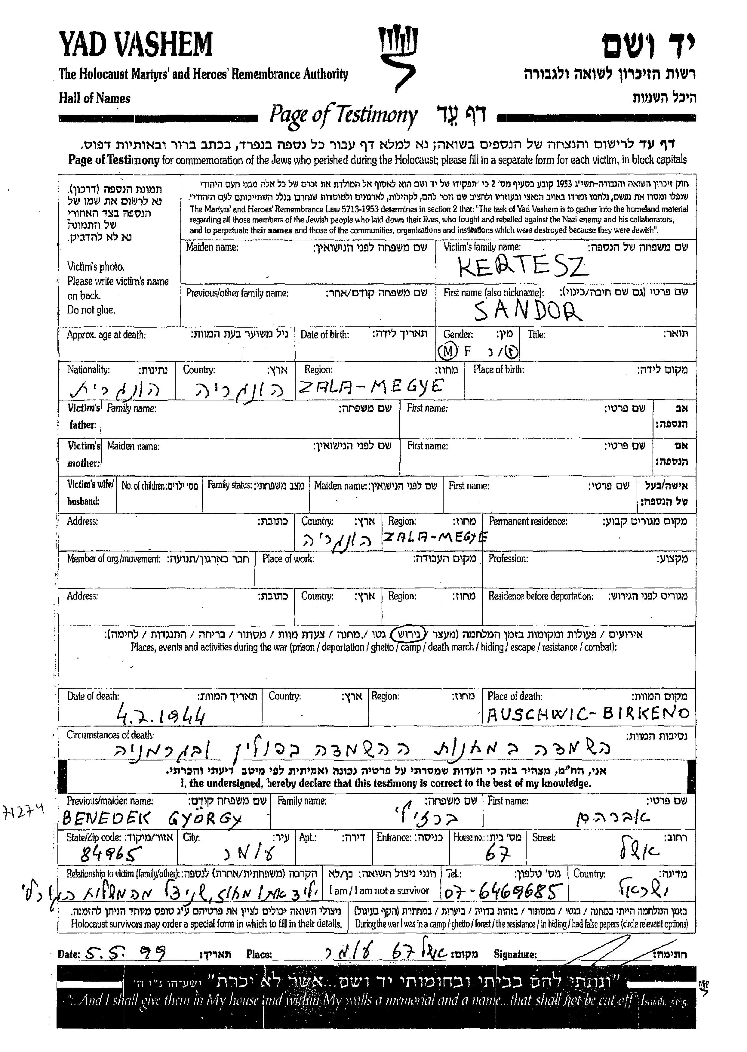 Kertesz Sandor Zala, Hungary Page of Testimony