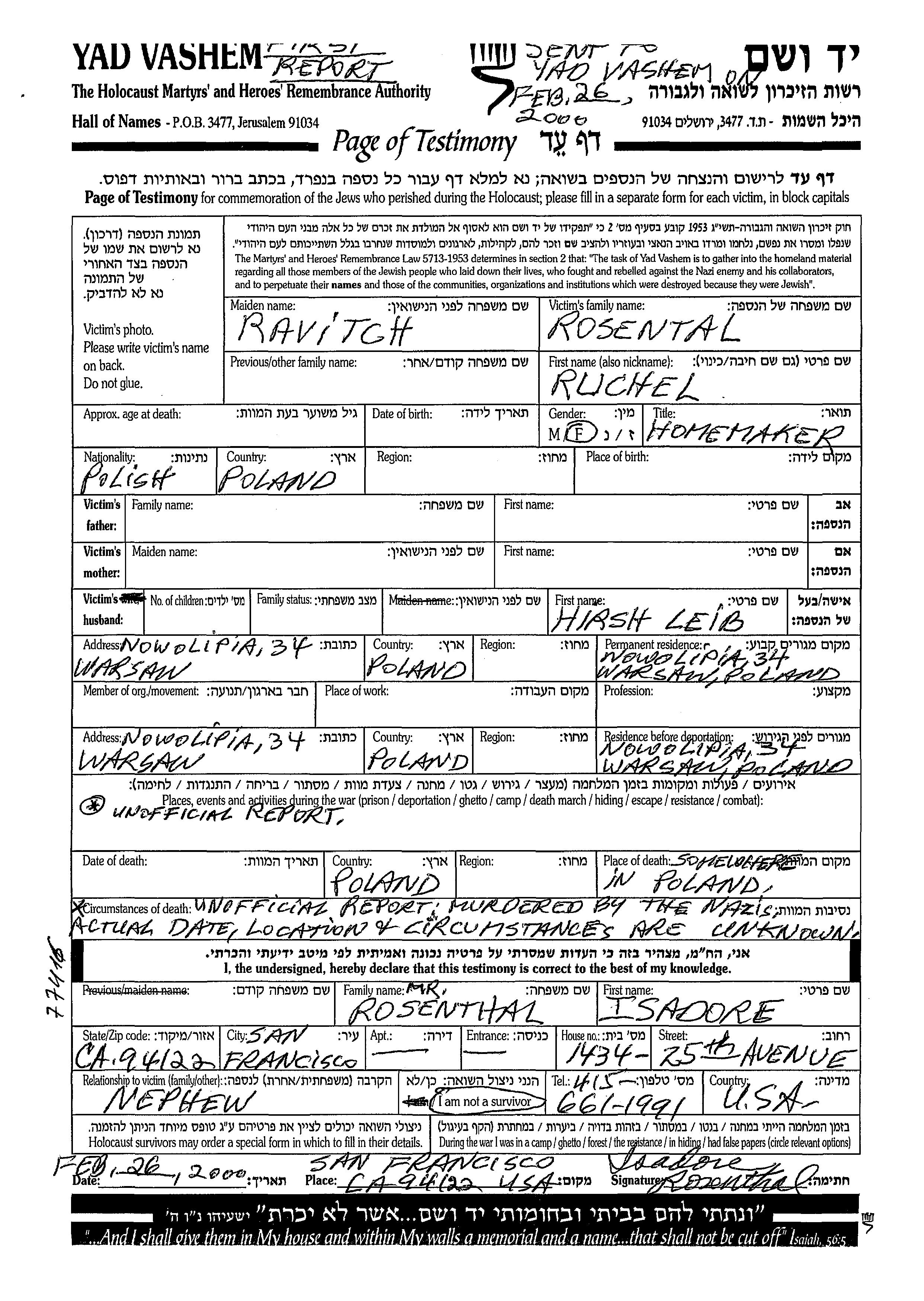 Rosental Ruchel Warszawa, Poland Page of Testimony