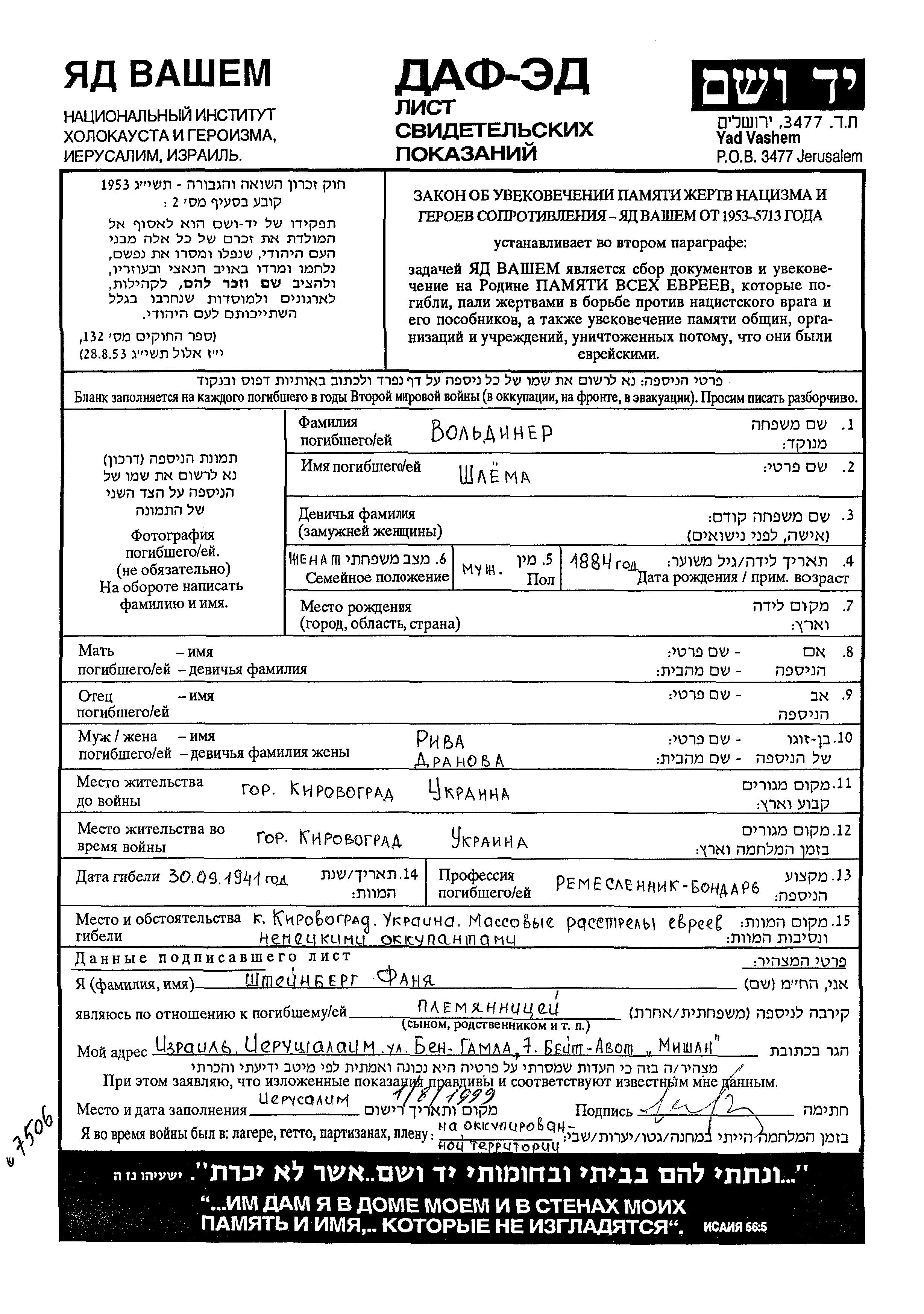 Voldiner Shlyoma 1884 Kirovograd, Ukraine (USSR) Page of Testimony