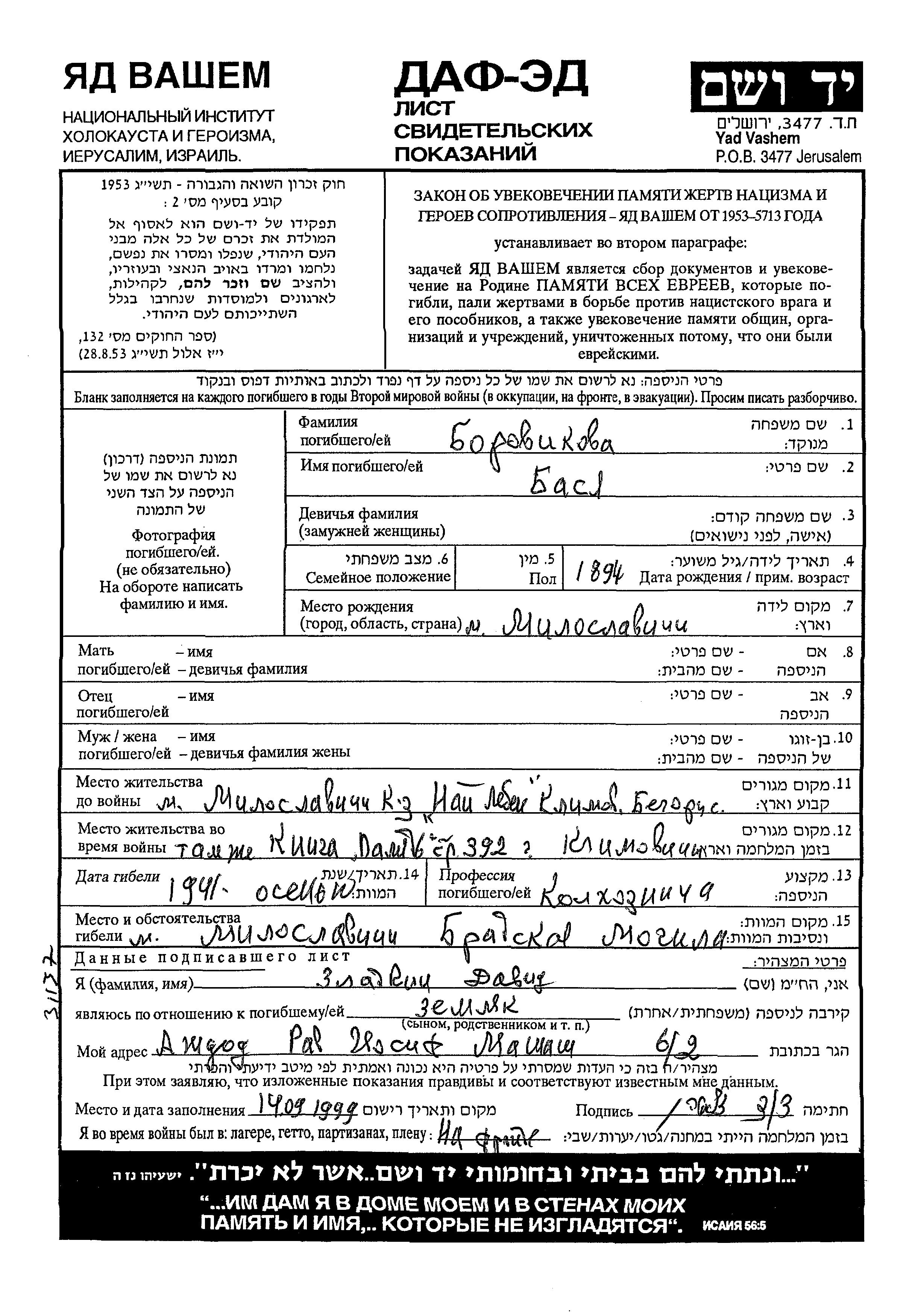 Basya Borovikov was born in Miloslavichi, Belorussia (USSR), 1894. She was a kolkhoznik / kolkhoznitza. Prior to WWII she lived in Miloslavichi, Belorussia (USSR). During the war she was in Miloslavichi, Belorussia (USSR). Basya was murdered in the Shoah. Place of death: Miloslavichi, Belorussia (USSR), 1941.