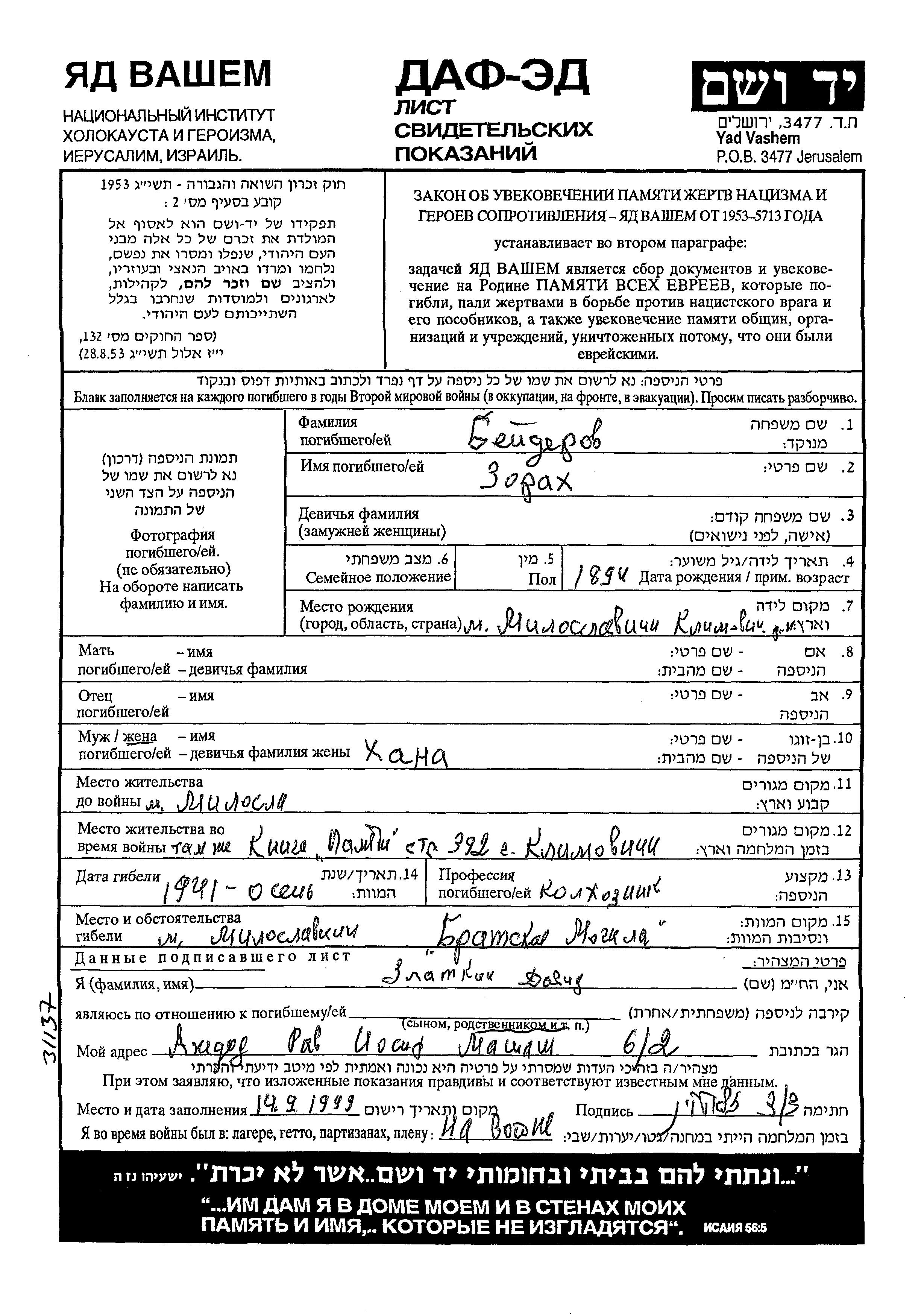 Zorakh Beiderov was born in Miloslavichi, Belorussia (USSR), 1894. He was a kolkhoznik / kolkhoznitza. Prior to WWII he lived in Miloslavichi, Belorussia (USSR). During the war he was in Miloslavichi, Belorussia (USSR). Zorakh was murdered in the Shoah. Place of death: Miloslavichi, Belorussia (USSR), 1941.