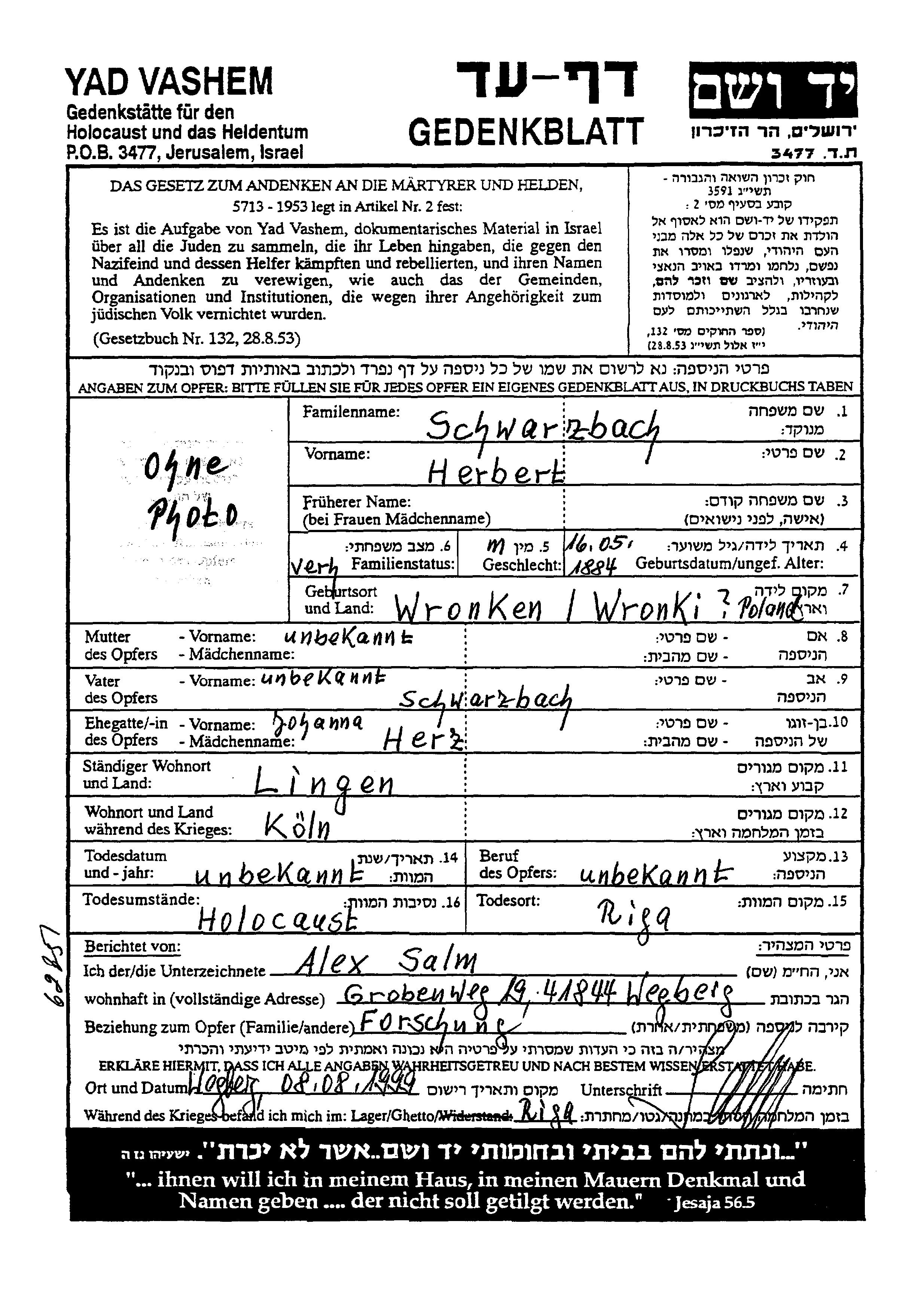 Herbert Schwarzbach was born in Wronki, Poland, 1884. He was married to Johanna nee Herz. Prior to WWII he lived in Lingen, Germany. During the war he was in Koeln, Germany. Herbert was murdered in the Shoah. Place of death: Riga, Latvia.
