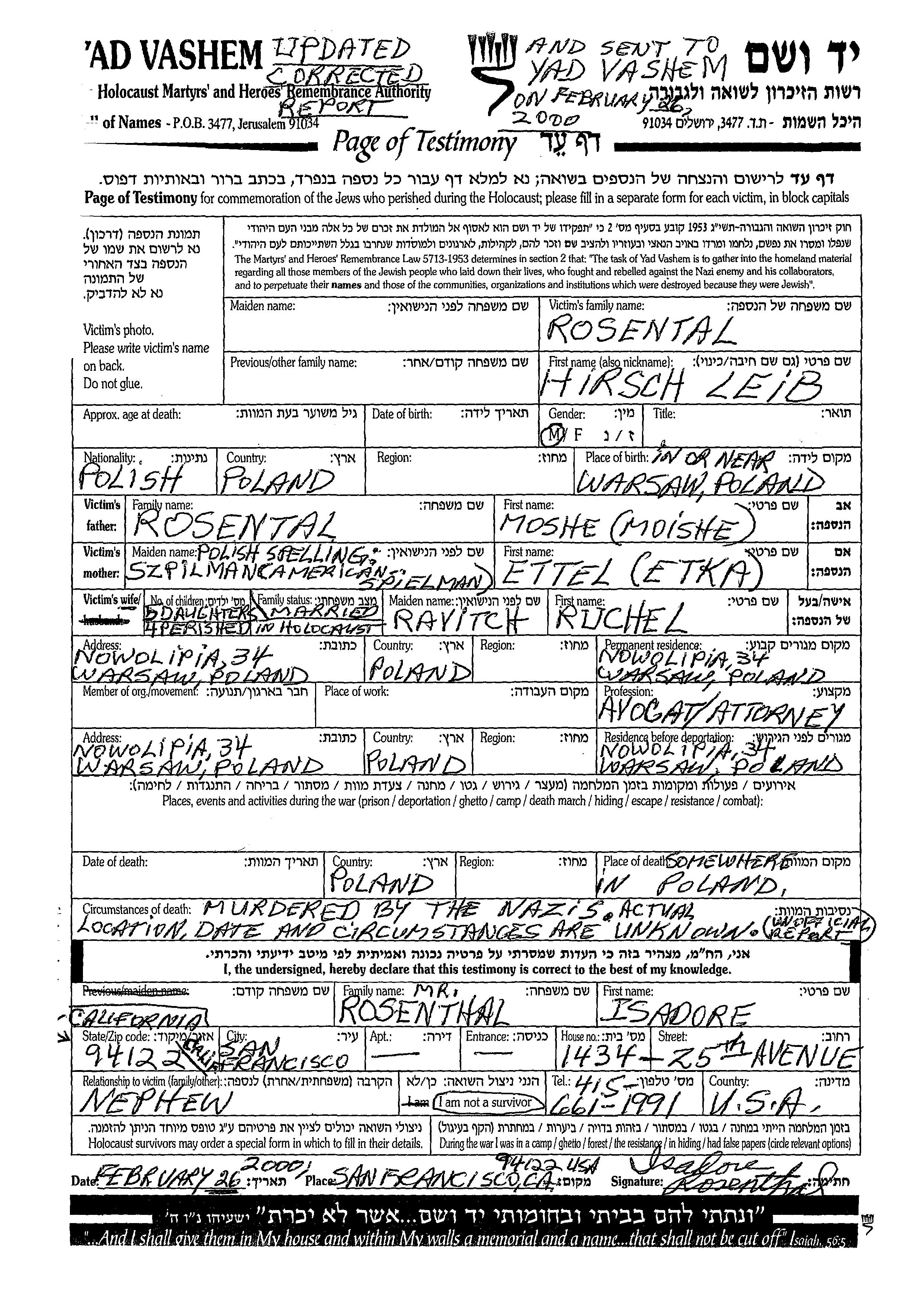 Rosental Hirsch Leib Varsha, Poland Page of Testimony