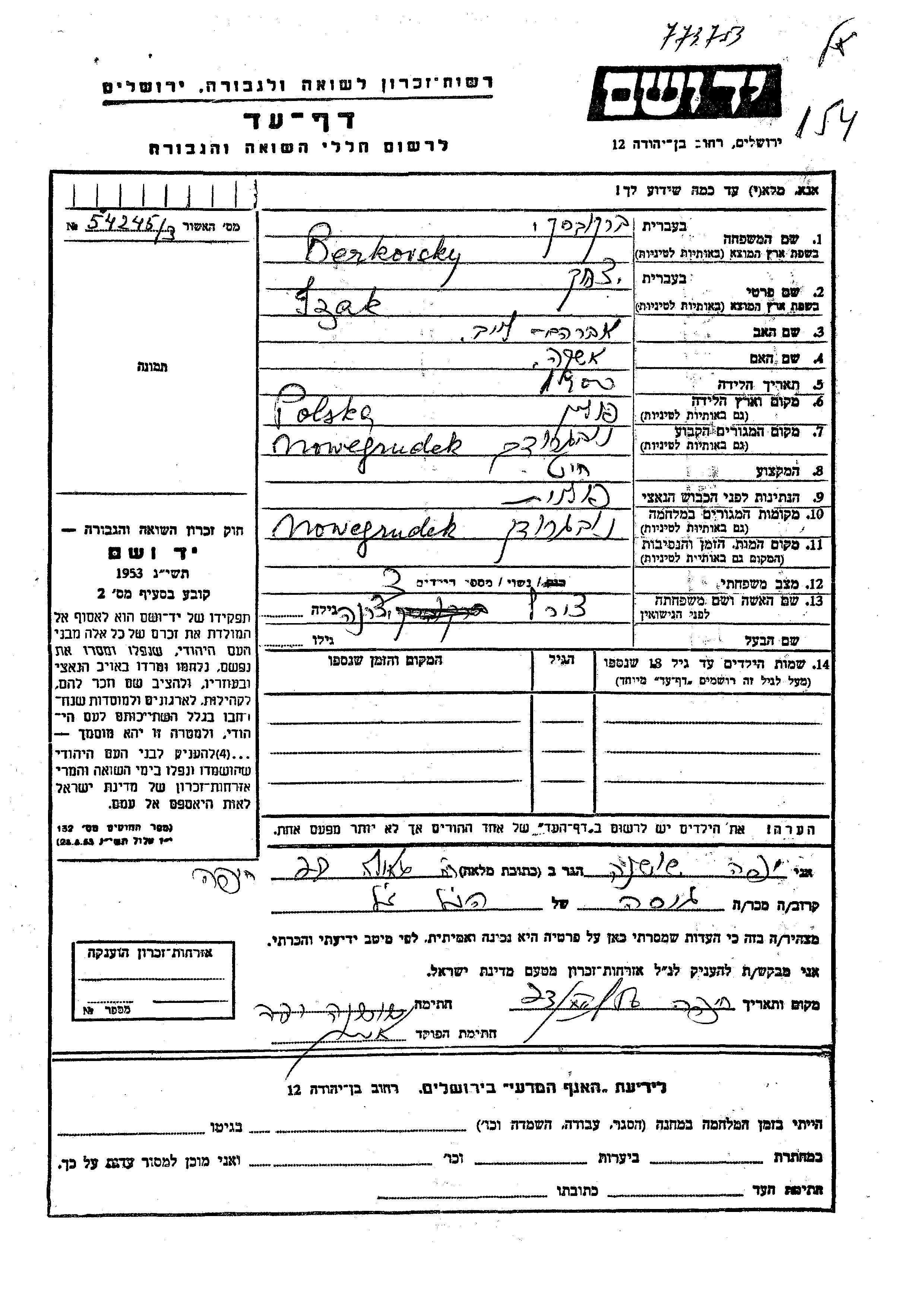 Berkovsky Izak 1900 Nowogrodek, Poland Page of Testimony
