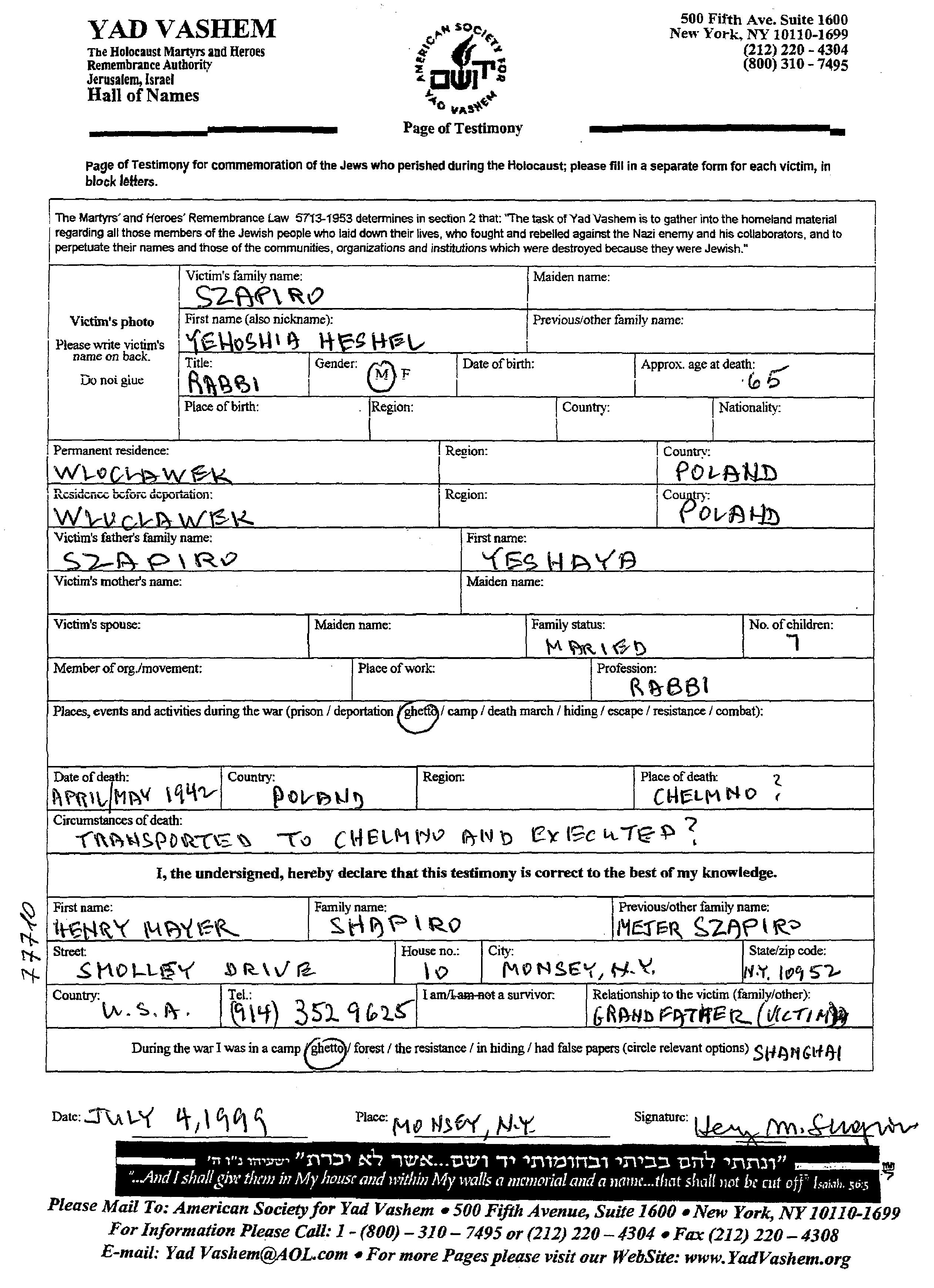 Yehoshia Szapiro was born to Yeshaya. He was a rabbi and married. Prior to WWII he lived in Wloclawek, Poland. During the war he was in Wloclawek, Poland. Yehoshia was murdered in the Shoah. Place of death: Chelmno, Poland, 1942.