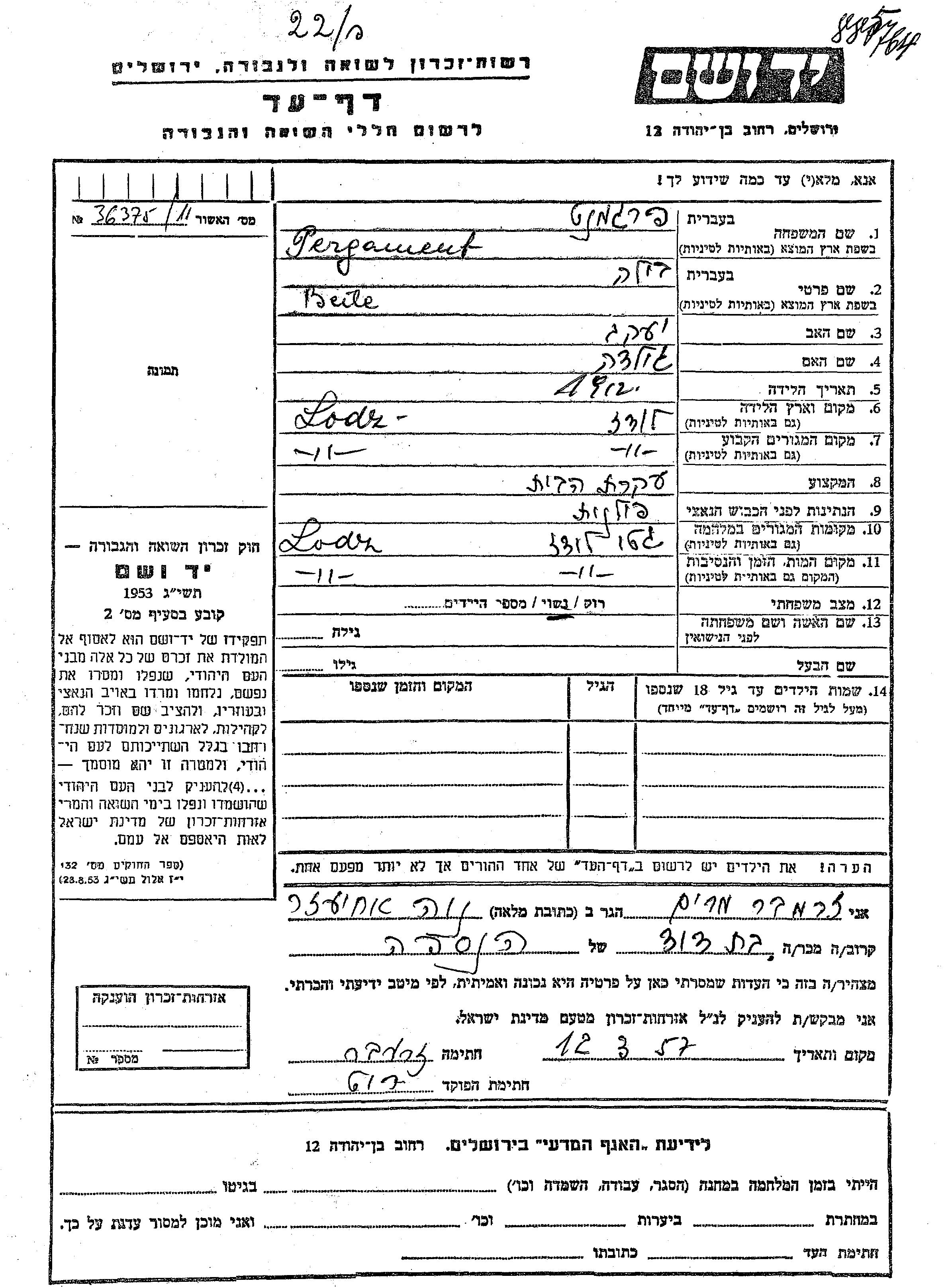 Beile Pergament was born in Lodz, Poland, 1912 to Yaakov and Golda. She was a housewife and married. Prior to WWII she lived in Lodz, Poland. During the war she was in Lodz, Poland.