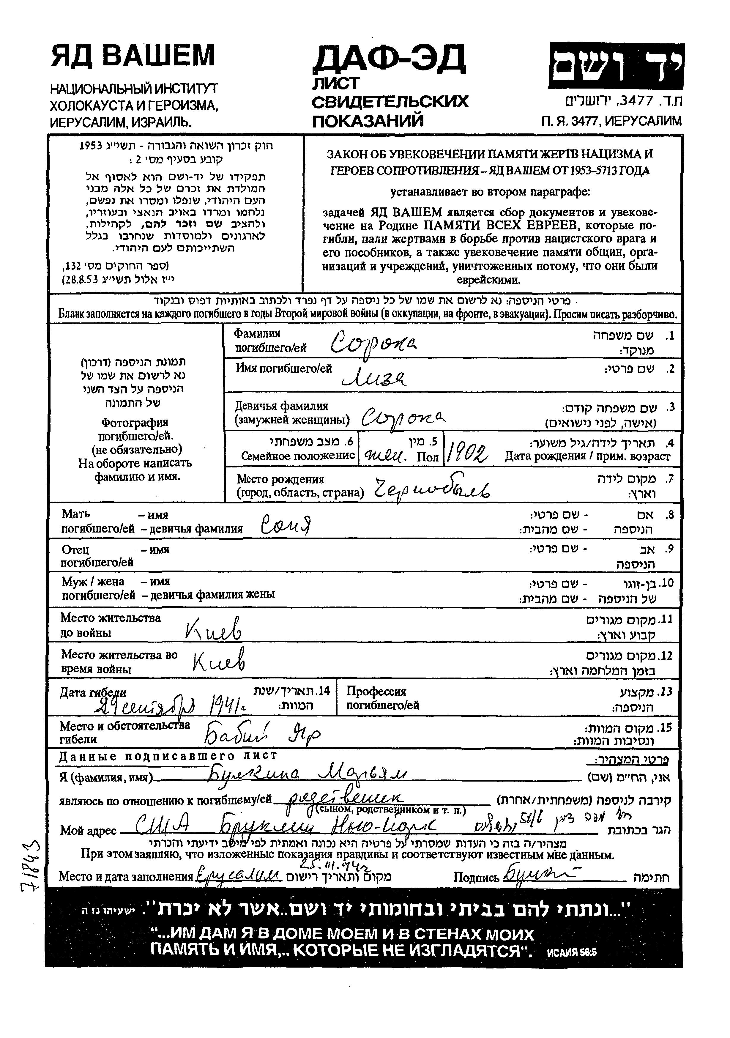 Soroka Liza 1902 Kiev, Ukraine (USSR) Page of Testimony
