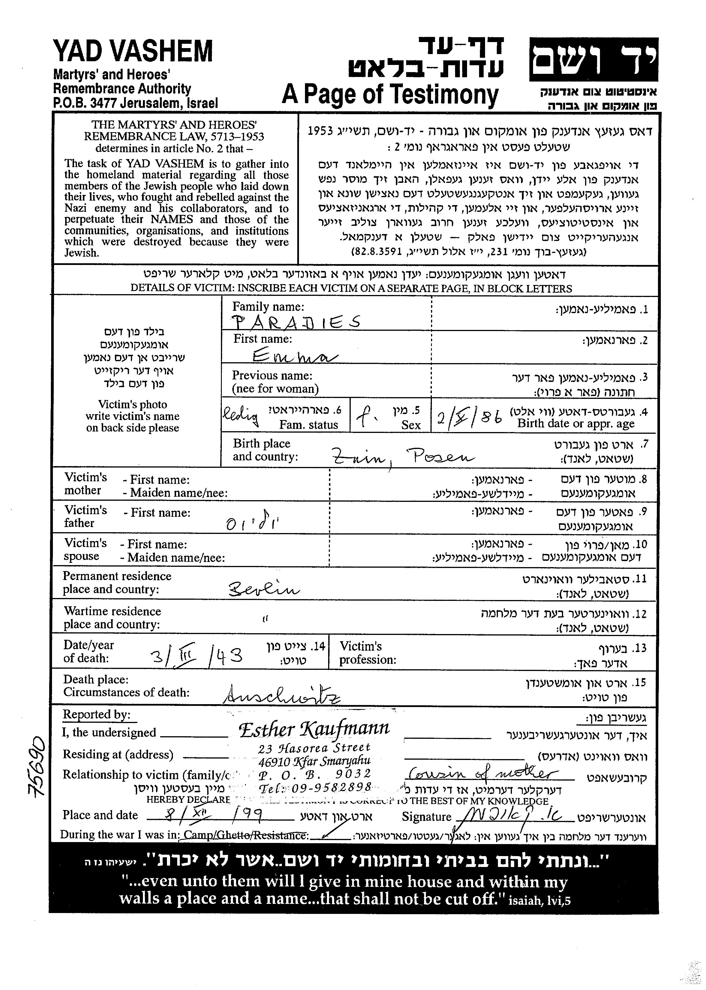 Emma Paradies was born in Znin, Poland, 1886 to Yulius. She was single. Prior to WWII she lived in Berlin, Germany. During the war she was in Berlin, Germany. Emma was murdered in the Shoah. Place of death: Auschwitz, Poland, 1943.