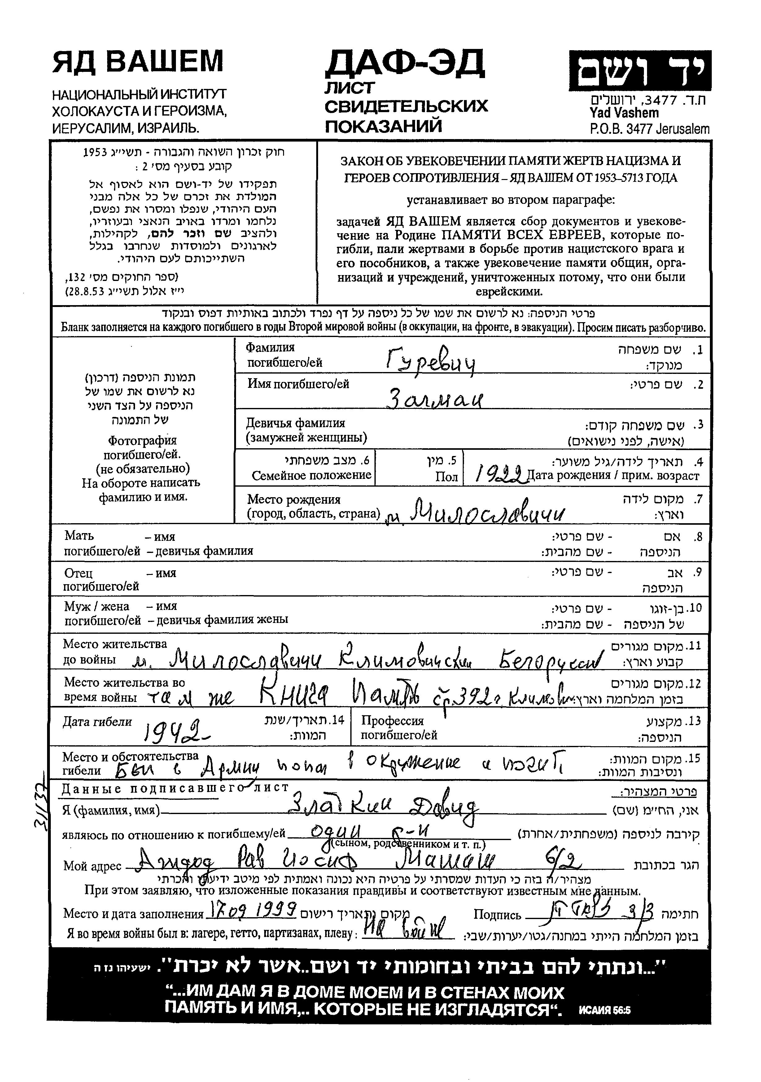 Zalman Gurevich was born in Miloslavichi, Belorussia (USSR), 1922. Prior to WWII he lived in Miloslavichi, Belorussia (USSR). During the war he was in the Soviet armed forces. Zalman was killed in military service in WWII. Place of death: the Soviet armed forces, 1942.