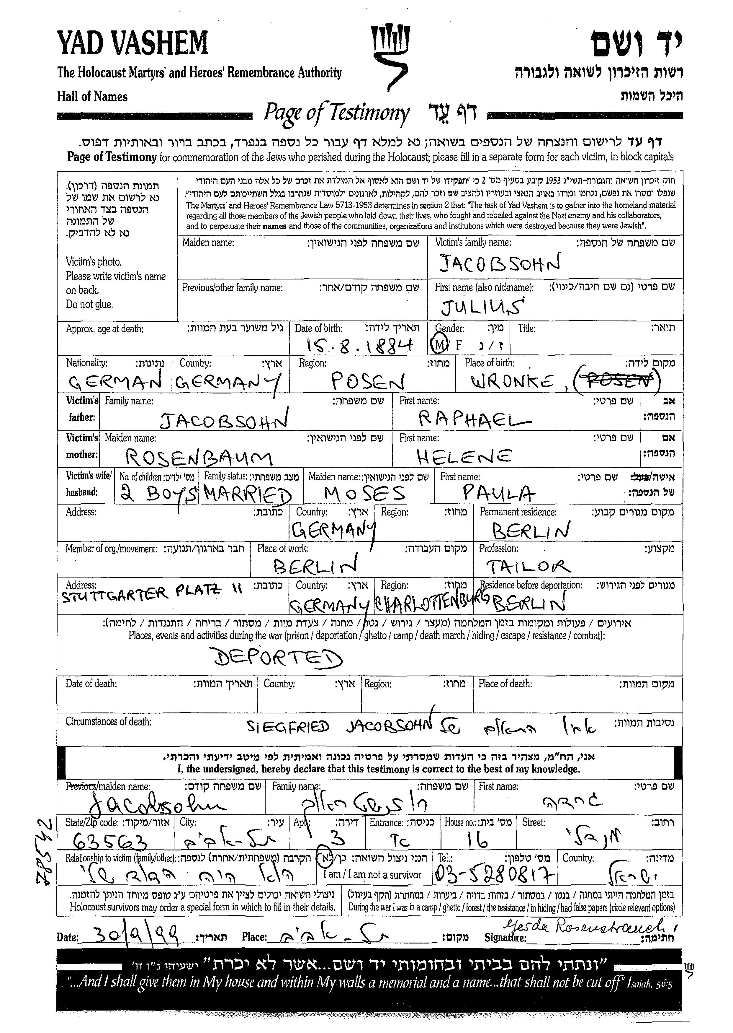 Julius Jacobsohn was born in Wronki, Poland, 1884 to Raphael and Helene. He was a tailor and married to Paula nee Moses. Prior to WWII he lived in Berlin, Germany. During the war he was in Berlin Charlottenburg, Germany. Julius was murdered in the Shoah.