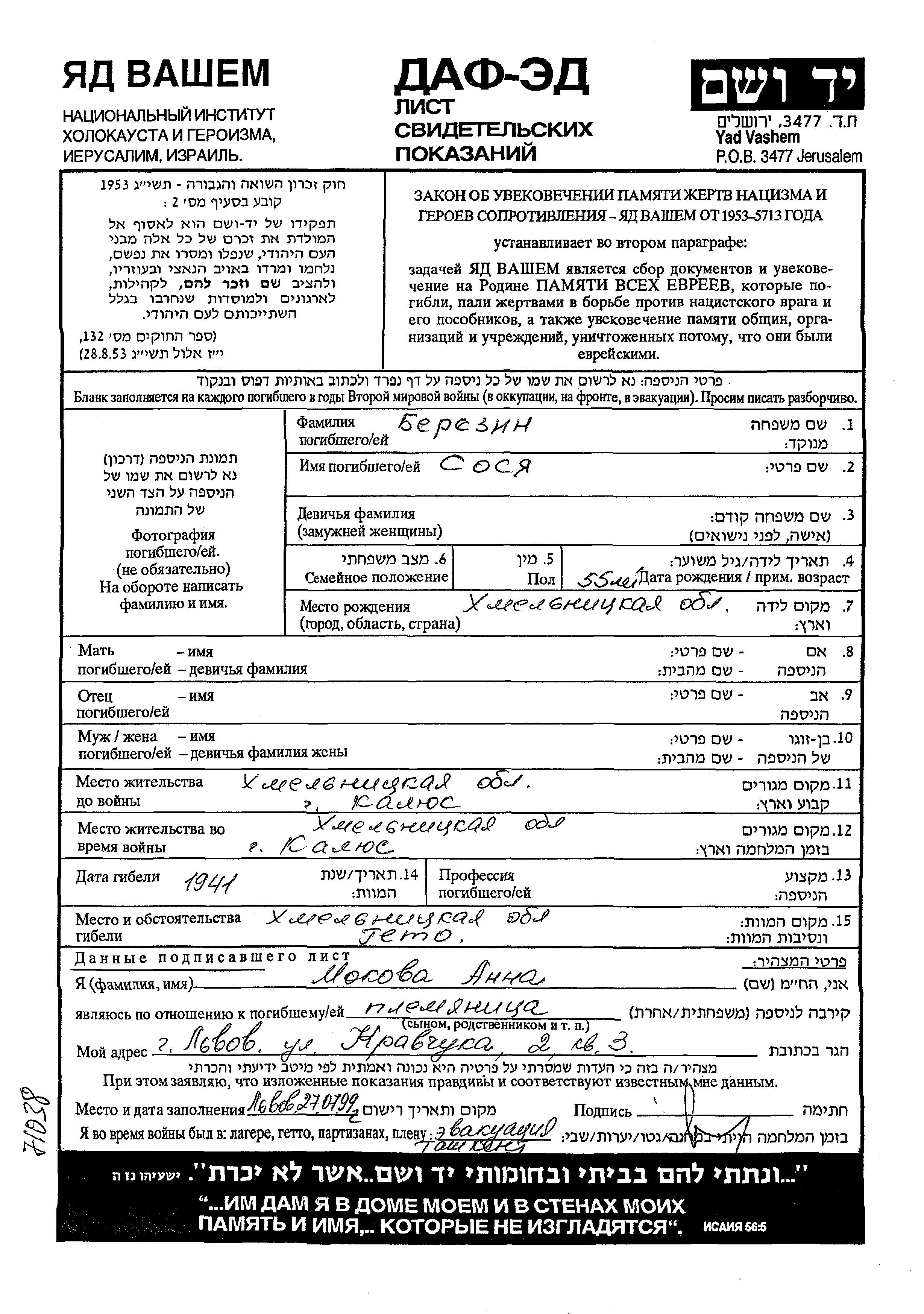 Sosya Berezin was born in Khmelnitskiy, Ukraine (USSR). Prior to WWII she lived in Kalyus, Ukraine (USSR). During the war she was in Kalyus, Ukraine (USSR). Sosya was murdered in the Shoah. Place of death: Khmelnitskiy, Ukraine (USSR), 1941.