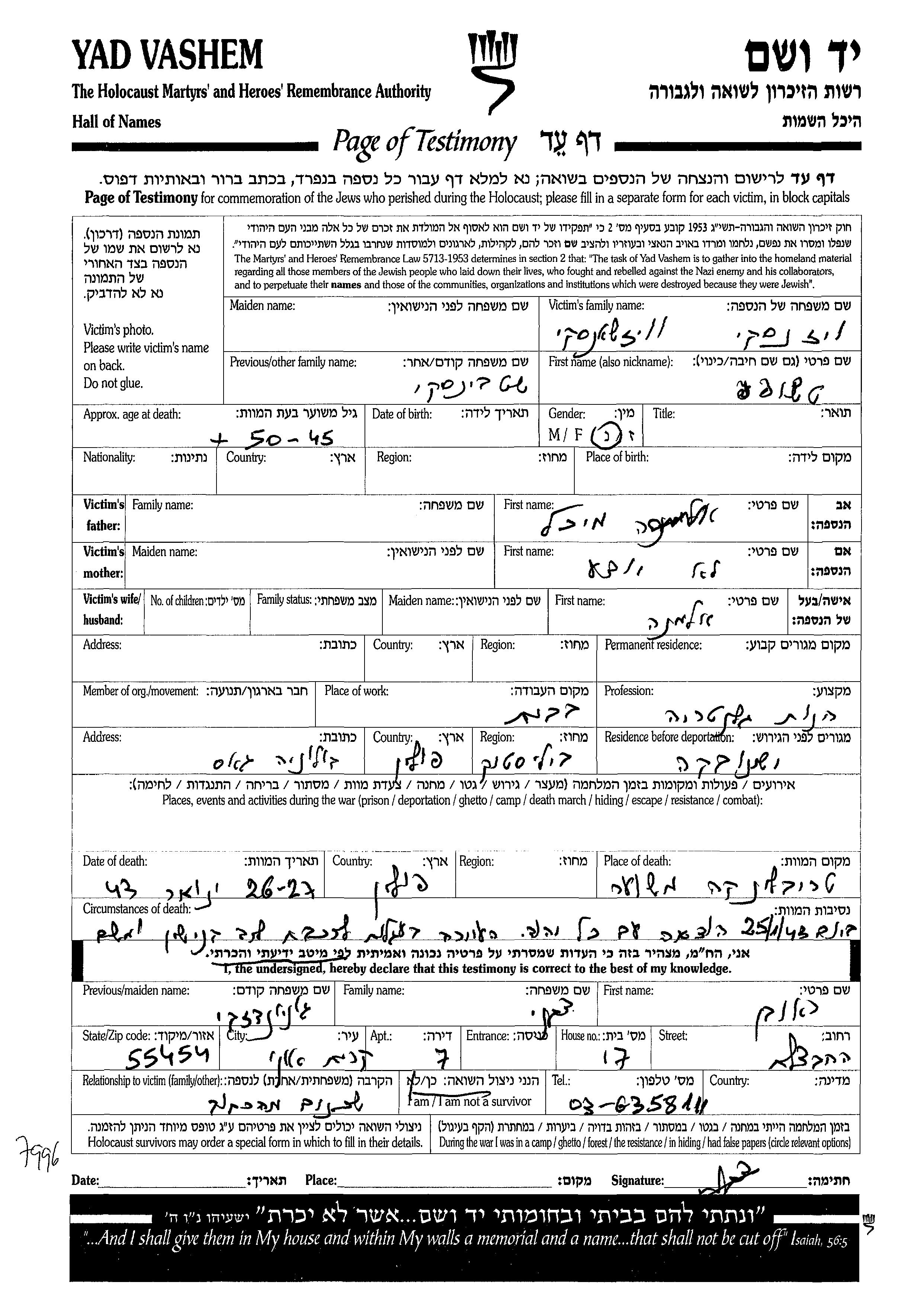 Yad Vashem - Pages of Testimony Names Memorial Collection