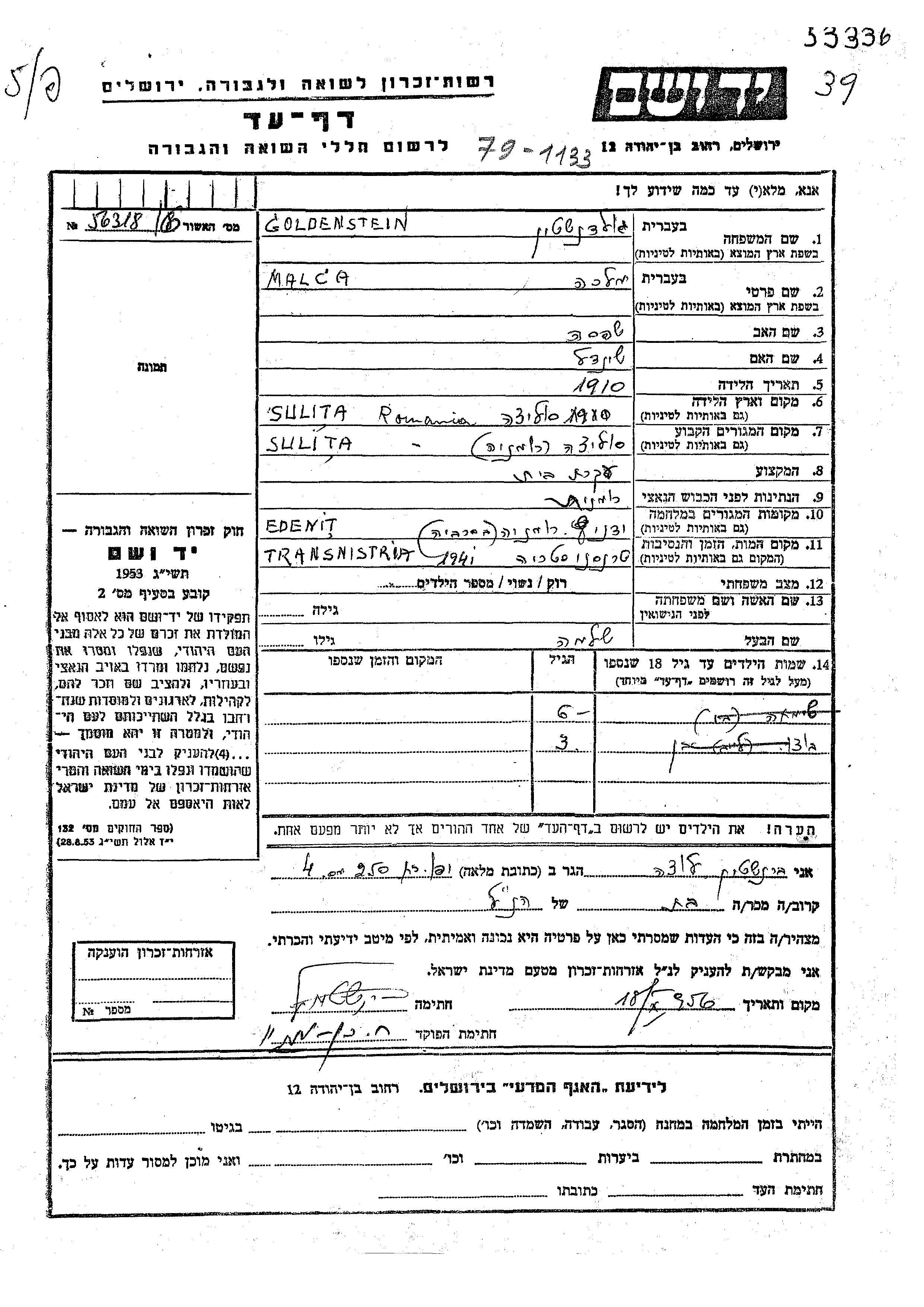 Goldenstein Malca 1910 Sulita, Romania Page of Testimony