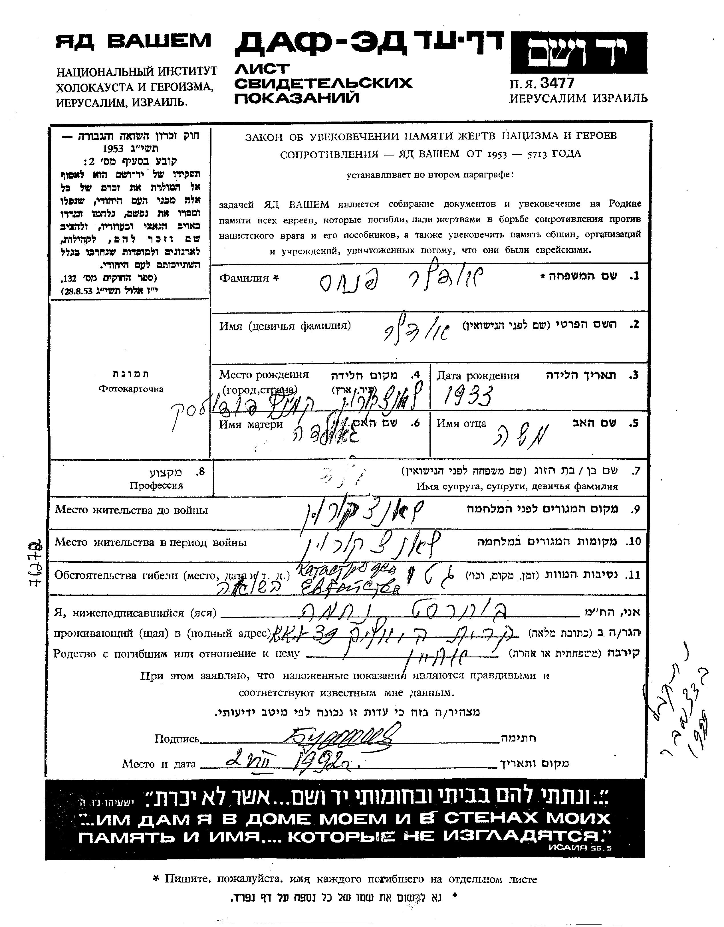 Yad Vashem - Pages of Testimony Names Memorial Collection