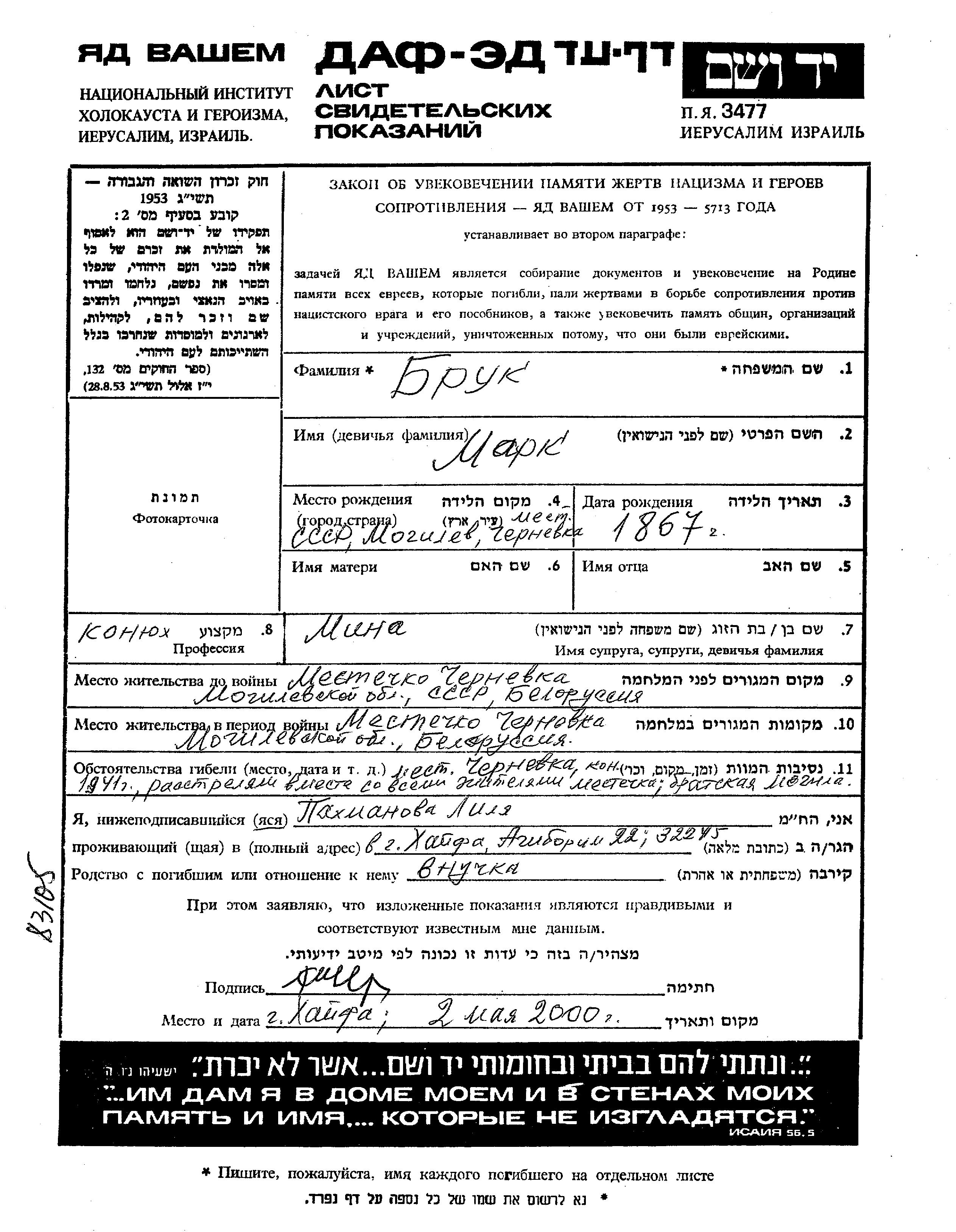 Mark Bruk was born in Chernevka, Belorussia (USSR), 1867. He was a groom and married to Mina. Prior to WWII he lived in Chernevka, Belorussia (USSR). During the war he was in Chernevka, Belorussia (USSR). Mark was murdered in the Shoah. Place of death: Chernevka, Belorussia (USSR), 1941.