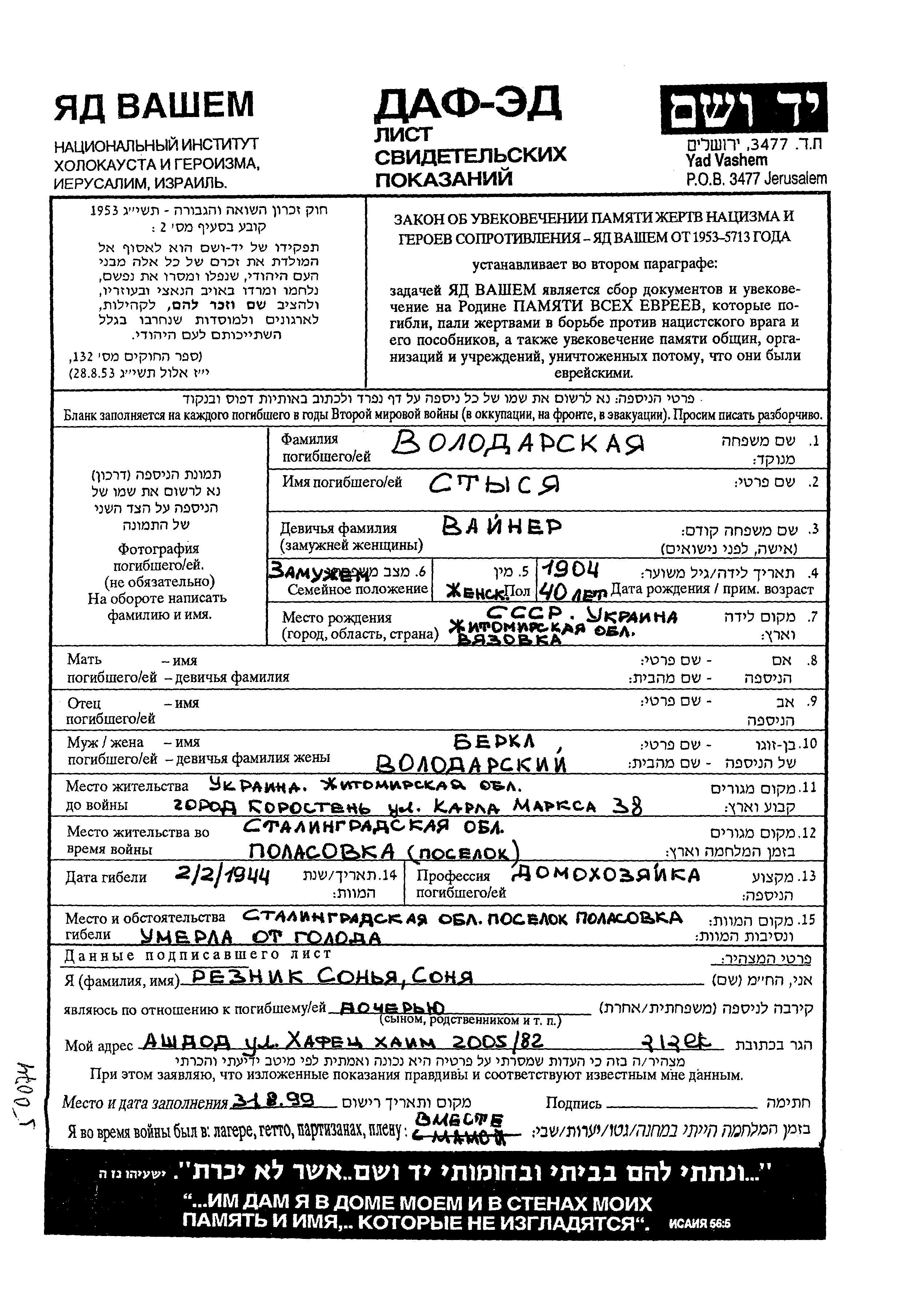Stysya Volodarskaya nee Vainer was born in Vyazovka, Ukraine (USSR), 1904. She was a housewife and married to Stysya nee Volodarski. Prior to WWII she lived in Korosten, Ukraine (USSR). During the war she was in Polasovka, Russia (USSR). Stysya was murdered in the Shoah. Place of death: Polasovka, Russia (USSR), 1944.