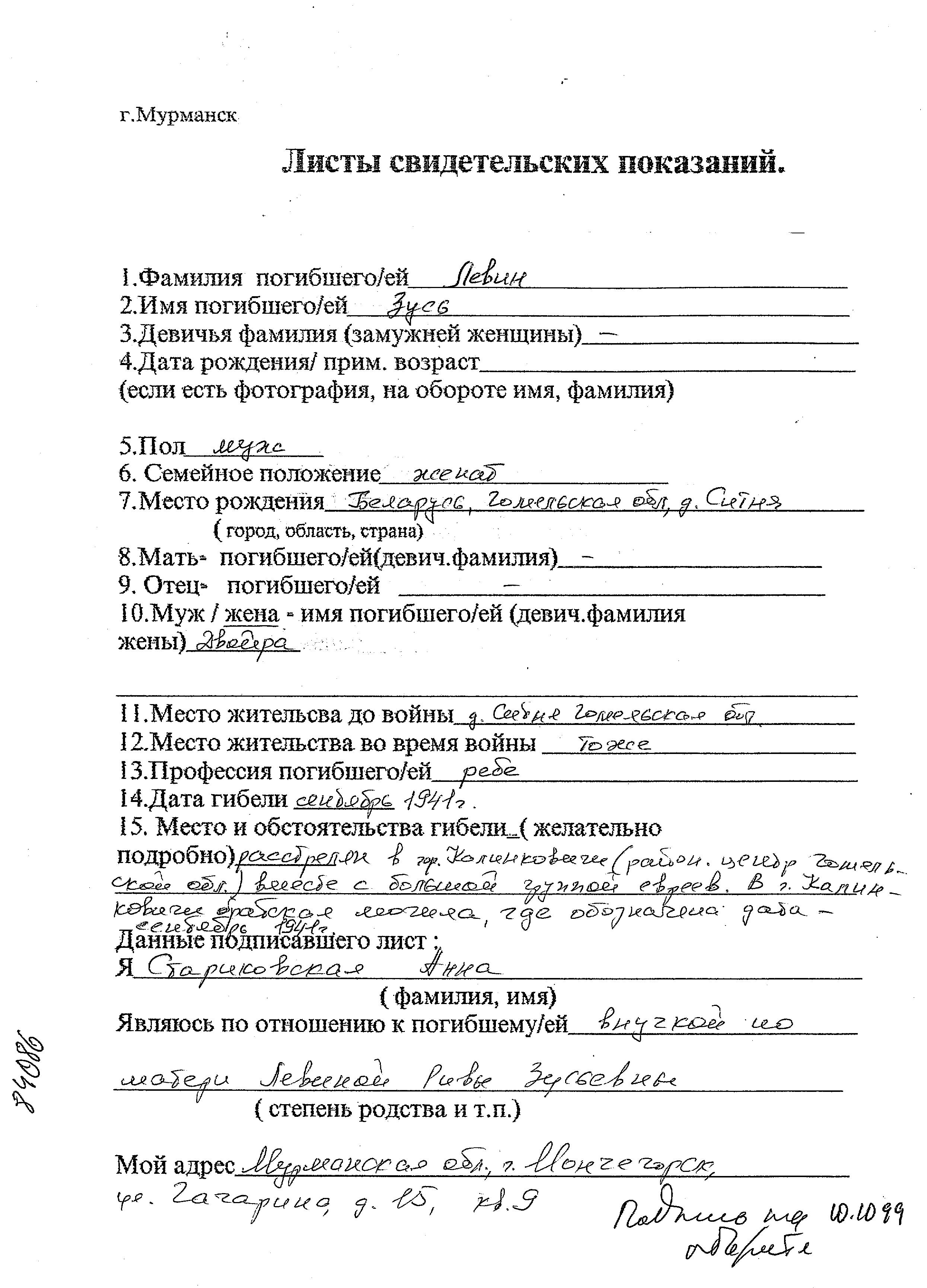Zus Levin was born in Sitnya, Belorussia (USSR). He was a rabbi and married to Dvoira. Prior to WWII he lived in Sitnya, Belorussia (USSR). During the war he was in Sitnya, Belorussia (USSR). Zus was murdered in the Shoah. Place of death: unknown, 1941.