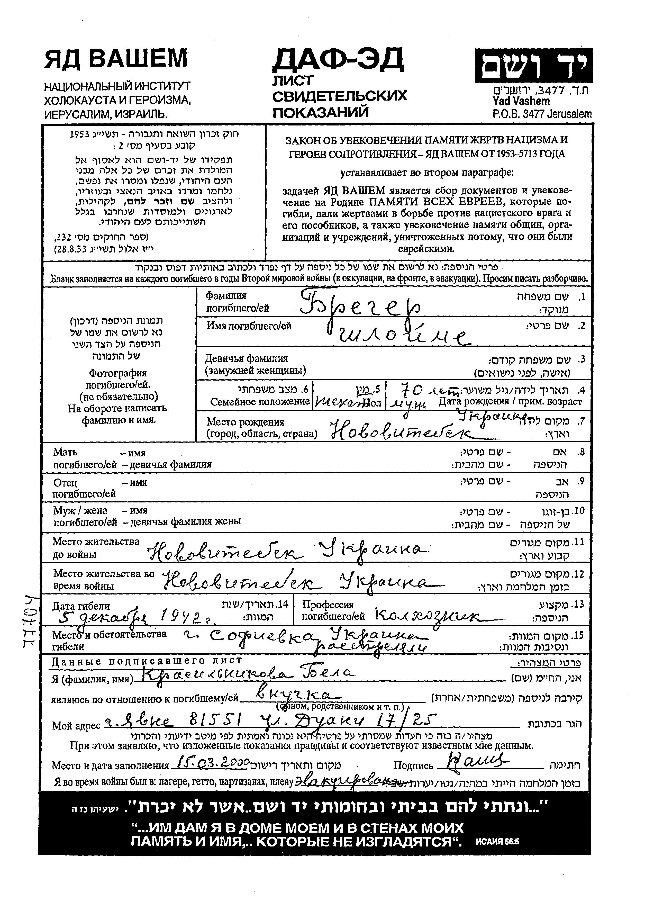 Breger Shloime Novo Vitebsk, Ukraine (USSR) Page of Testimony