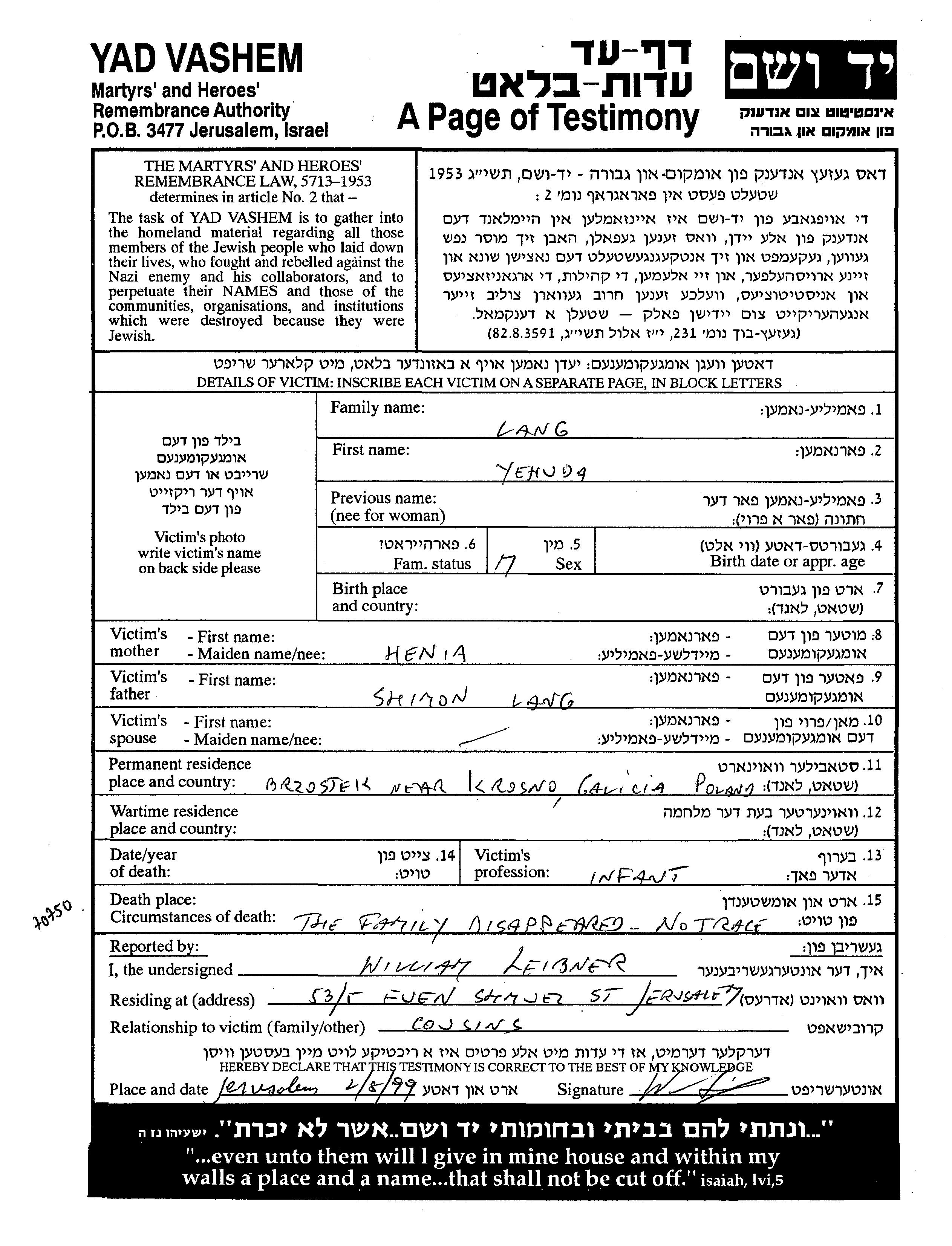 Lang Yehuda Brzostek, Poland Page of Testimony