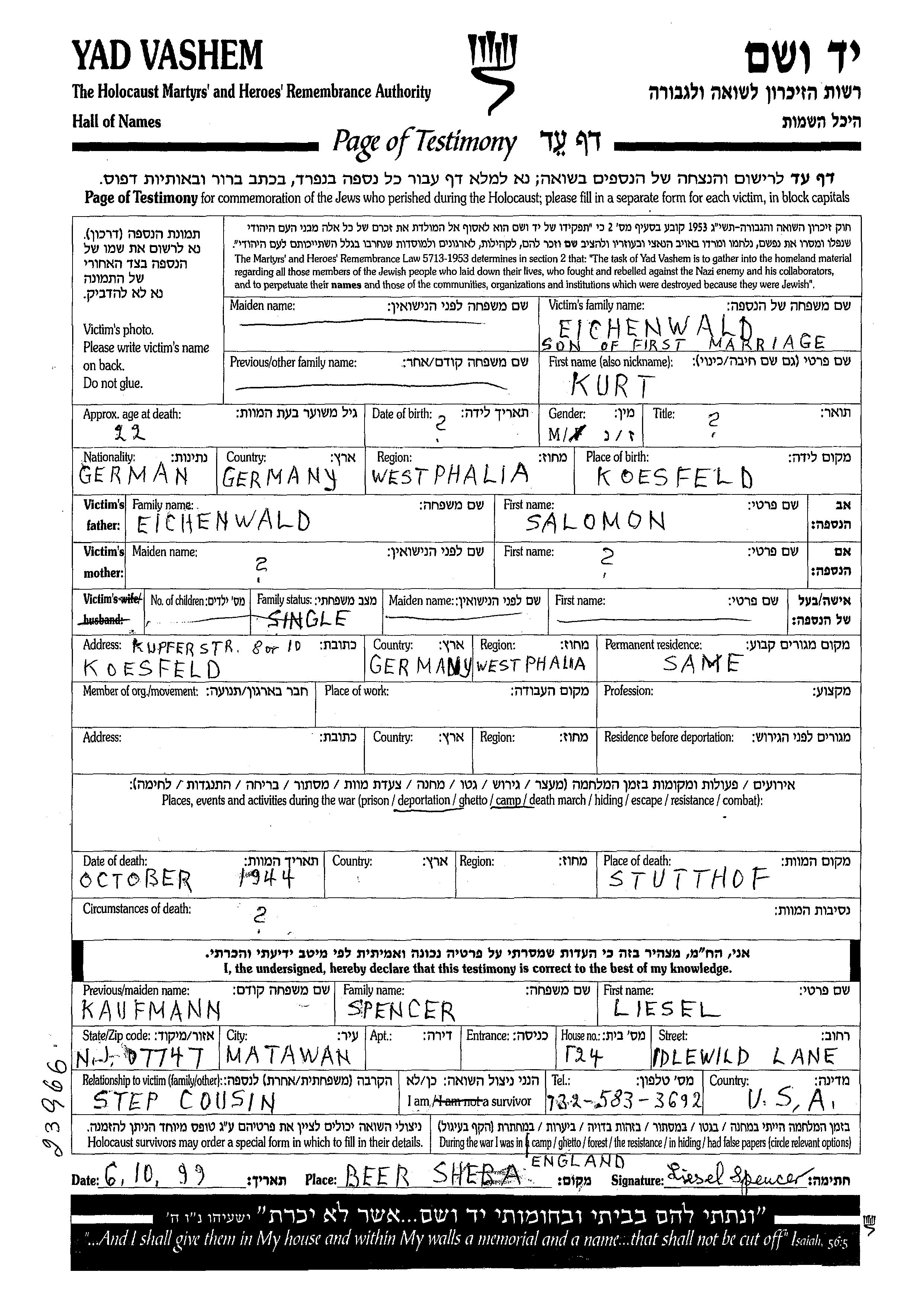 Eichenwald Kurt Koesfeld, Germany Page of Testimony