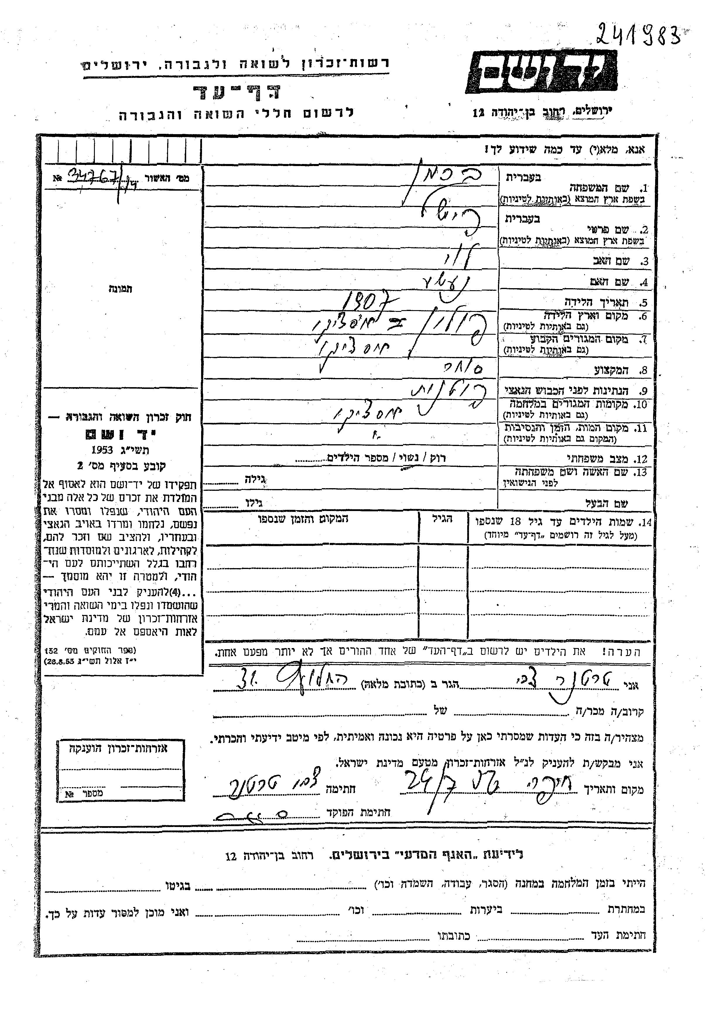 Fishel Berman was born in Miescisko, Poland, 1907 to Levi and Neshe. He was a merchant and married. Prior to WWII he lived in Miescisko, Poland. During the war he was in Miescisko, Poland. Fishel was murdered in the Shoah. Place of death: Miescisko, Poland.