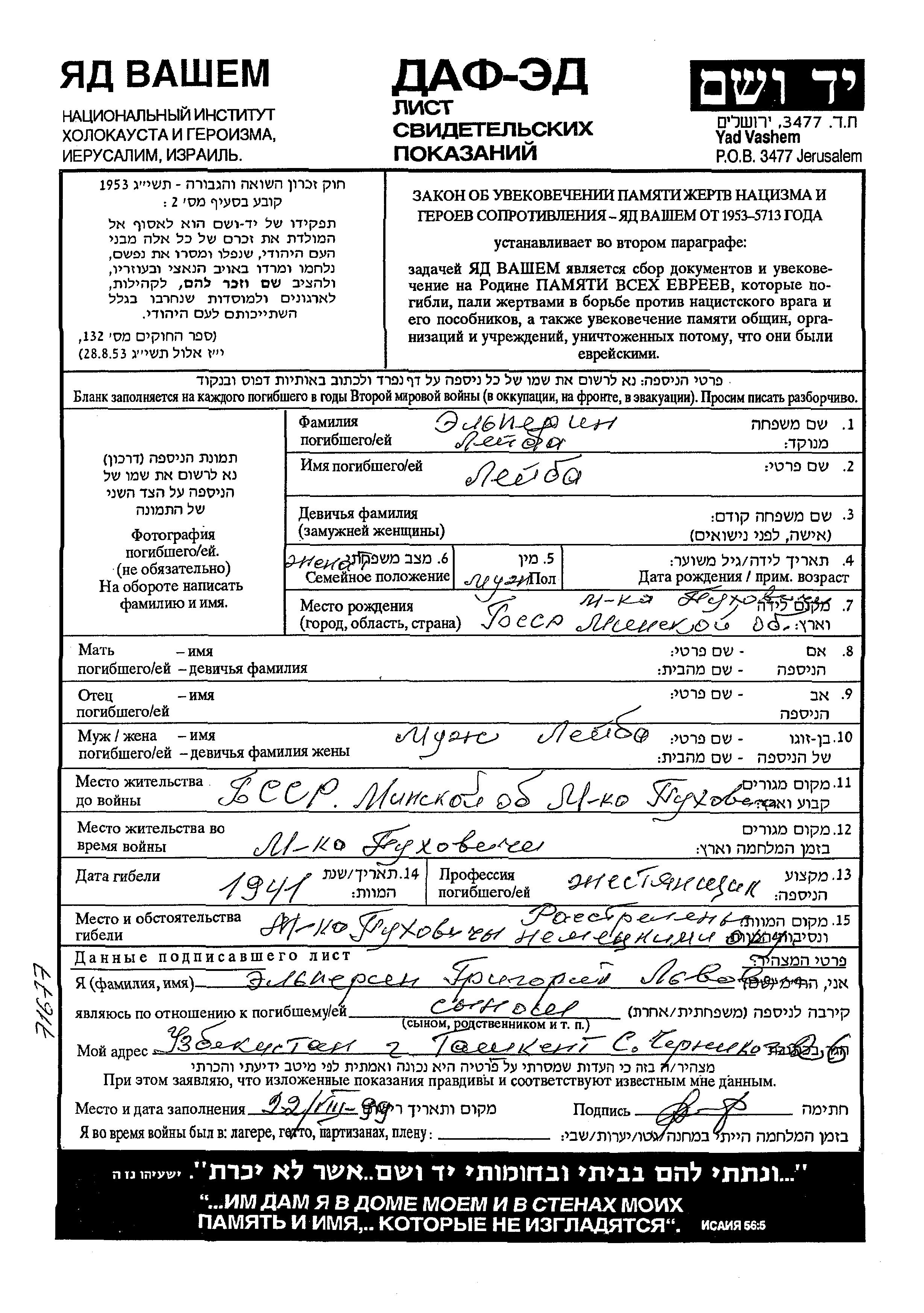 Elperin Leiba Pukhovichi, Belorussia (USSR) Page of Testimony