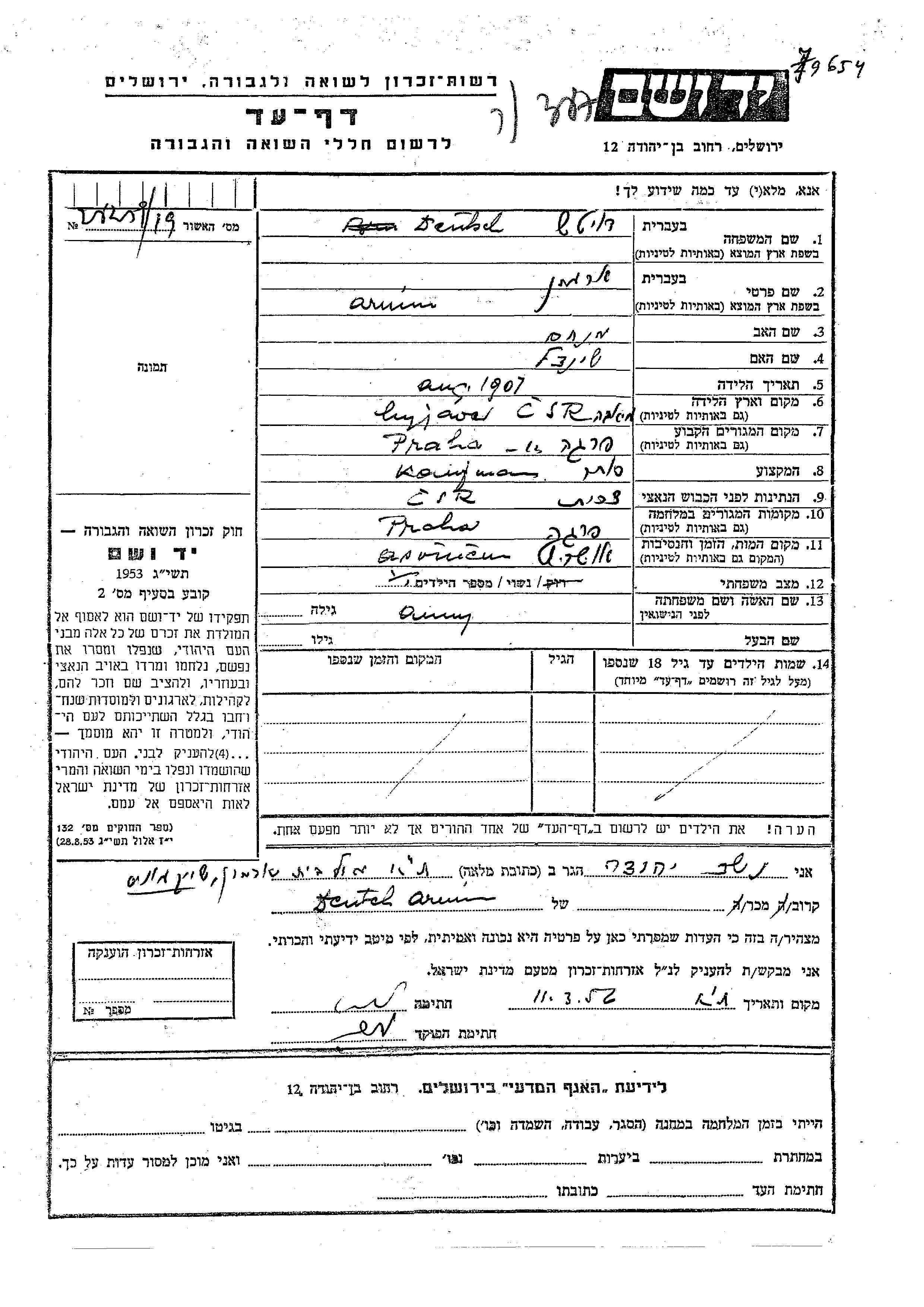 Armin Deutsch was born in Miava, Czechoslovakia, 1907 to Menakhem and Sheindl. He was a merchant and married to Anny. Prior to WWII he lived in Praha, Czechoslovakia. During the war he was in Praha, Czechoslovakia. Armin was murdered in the Shoah. Place of death: Auschwitz, Poland.