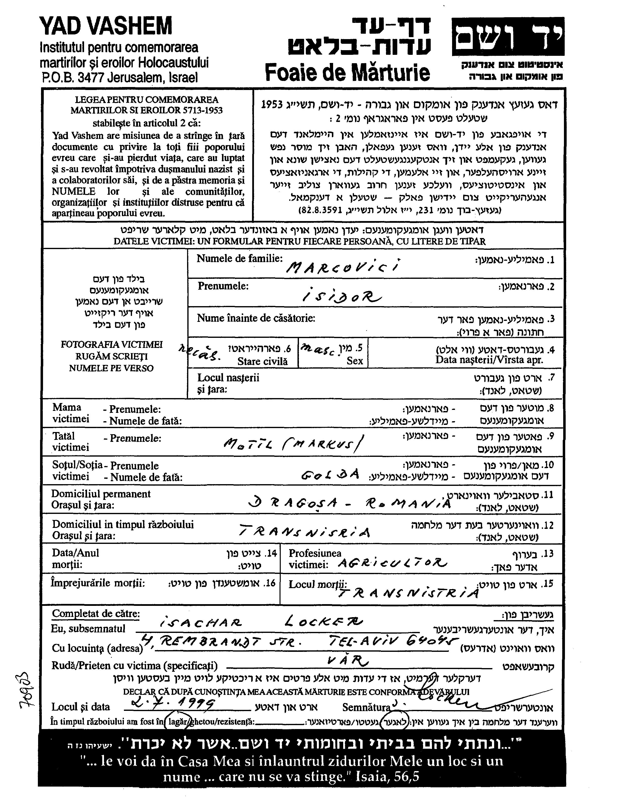 Marcovici Isidor Dragosa, Romania Page of Testimony