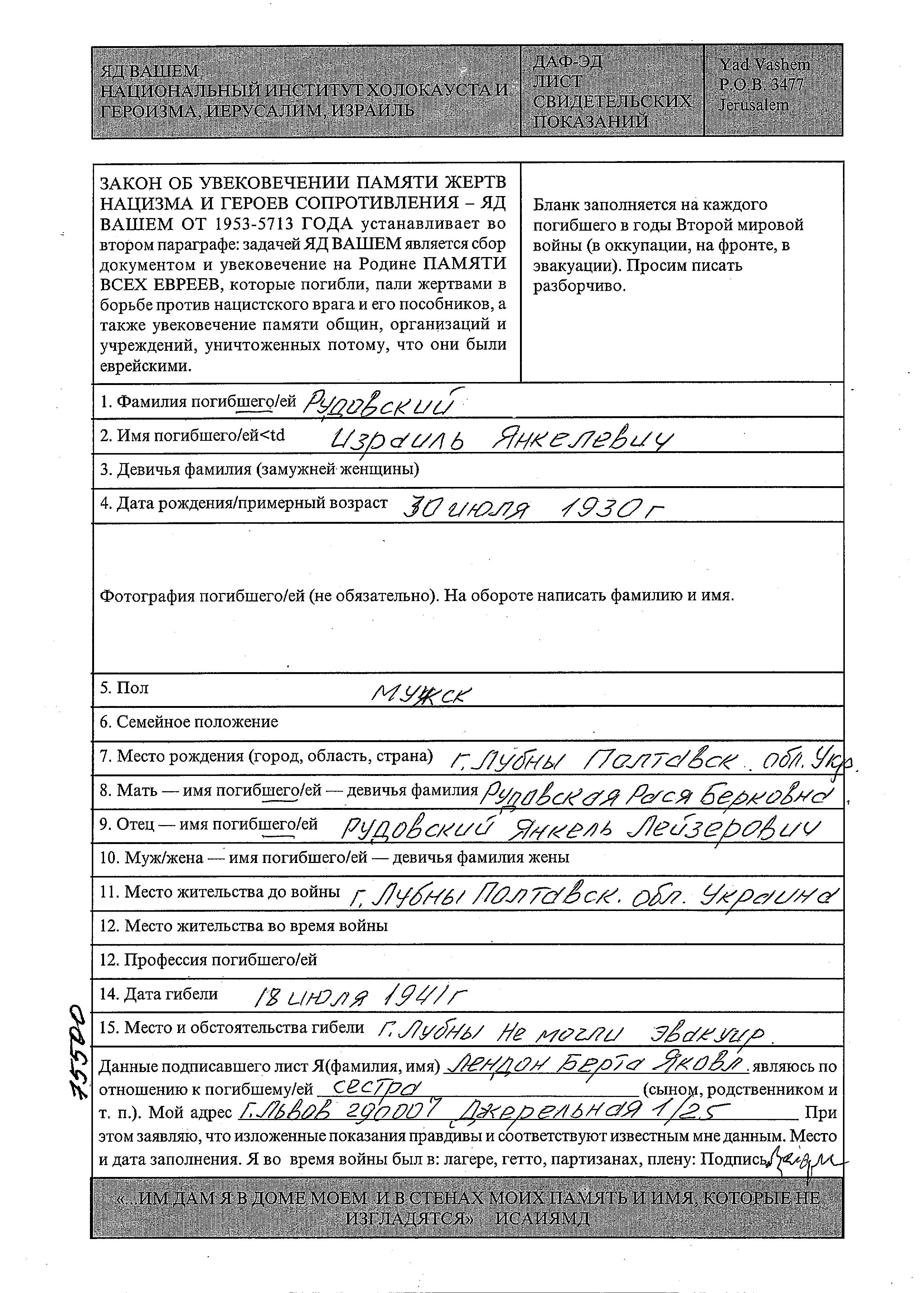 Izrail Rudovski was born in Lubny, Ukraine (USSR), 1930 to Yankel and Rasya. He was child. Prior to WWII he lived in Lubny, Ukraine (USSR). During the war he was in Lubny, Ukraine (USSR). Izrail was murdered in the Shoah. Place of death: Lubny, Ukraine (USSR), 1941.