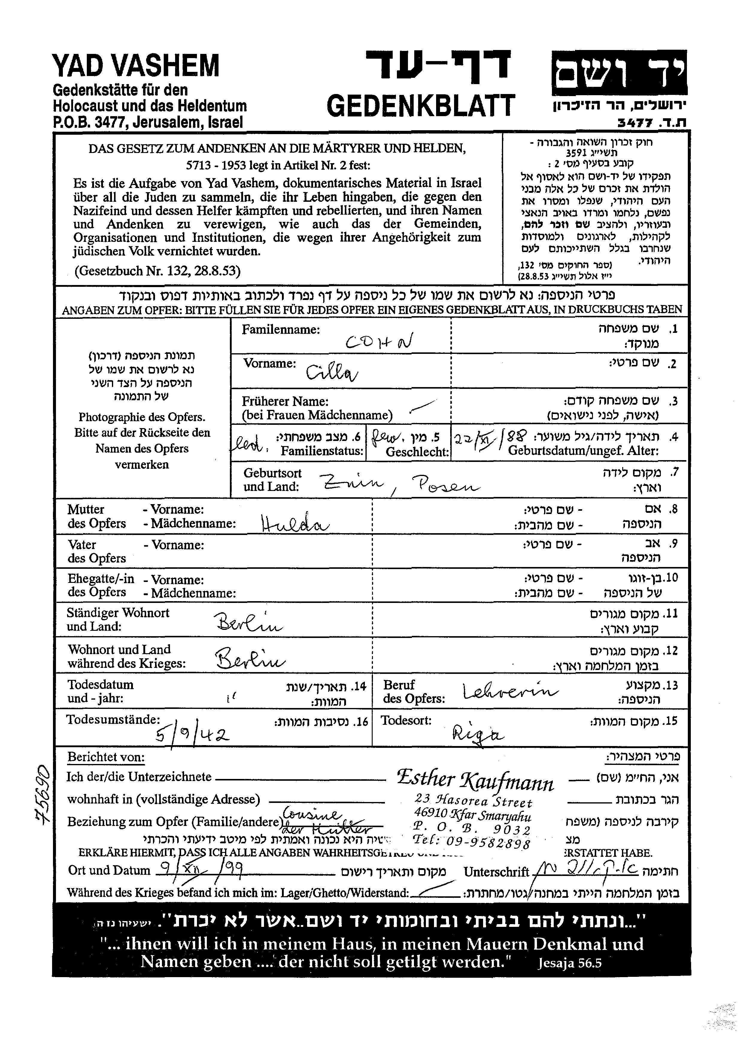 Cilla Cohn was born in Znin, Poland, 1888 to Hulda. She was a teacher and single. Prior to WWII she lived in Berlin, Germany. During the war she was in Berlin, Germany. Cilla was murdered in the Shoah. Place of death: Riga, Latvia, 1942.