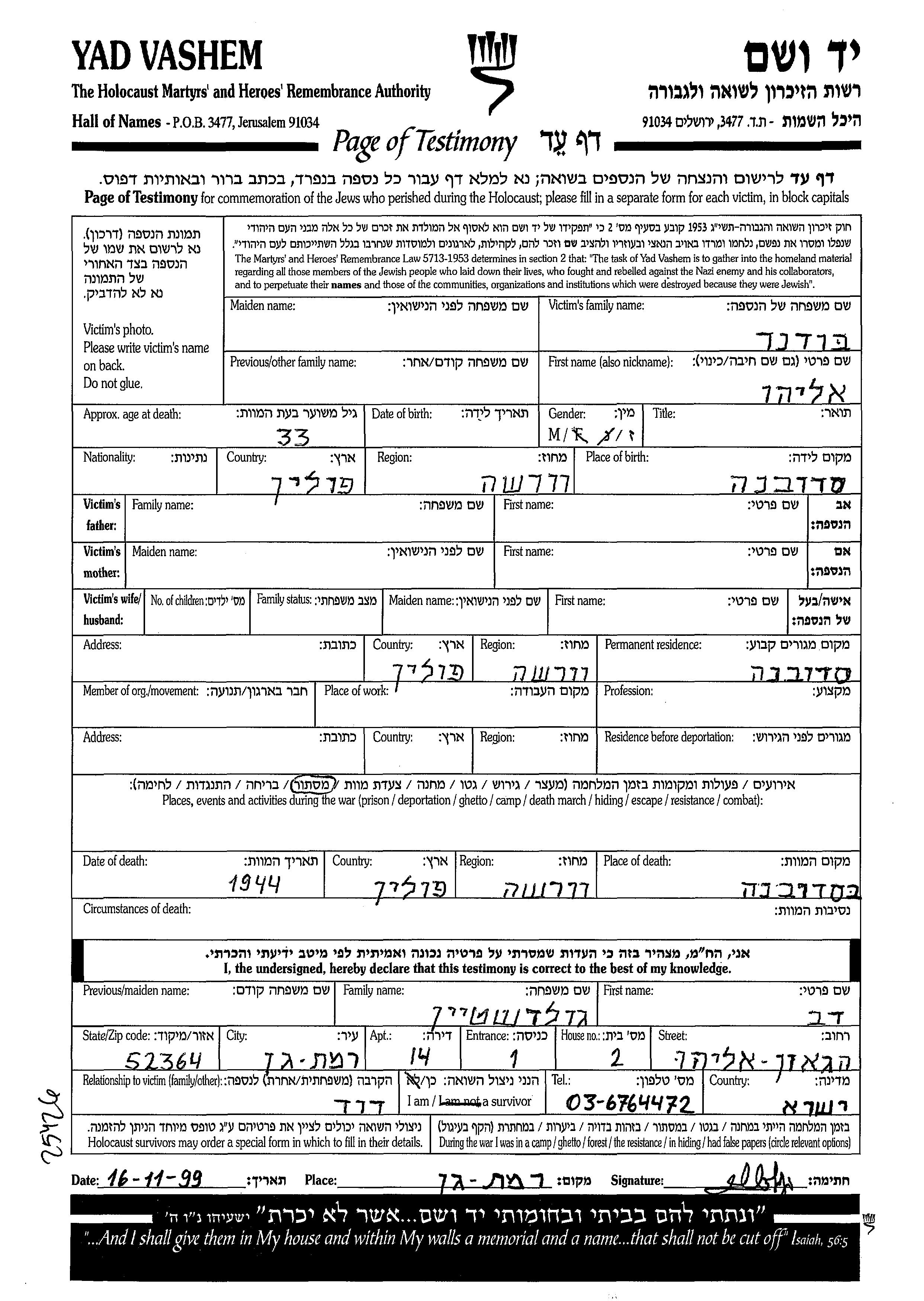 Bodner Eliahu Sadowne, Poland Page of Testimony