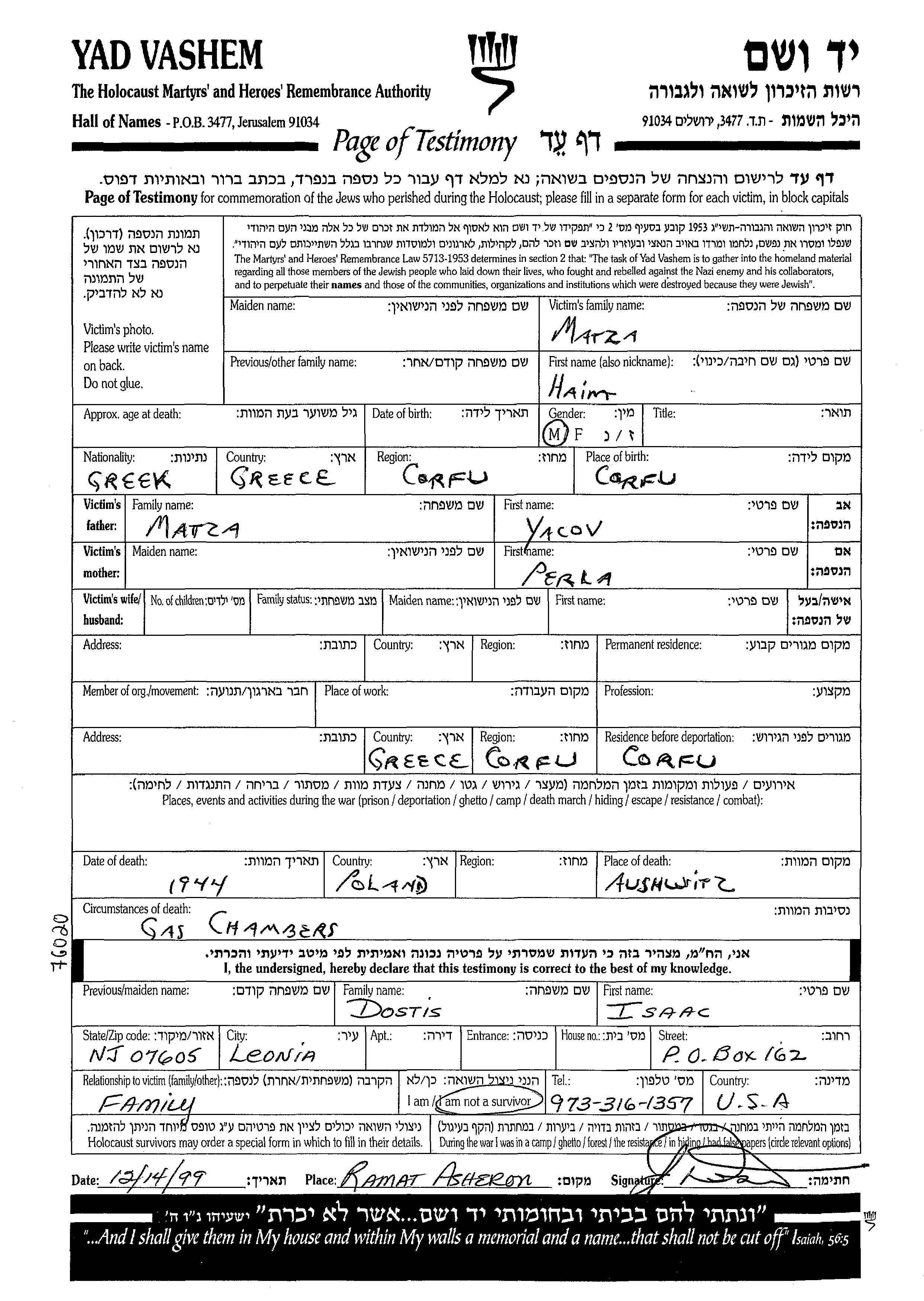 Matza Haim unstated place, Page of Testimony