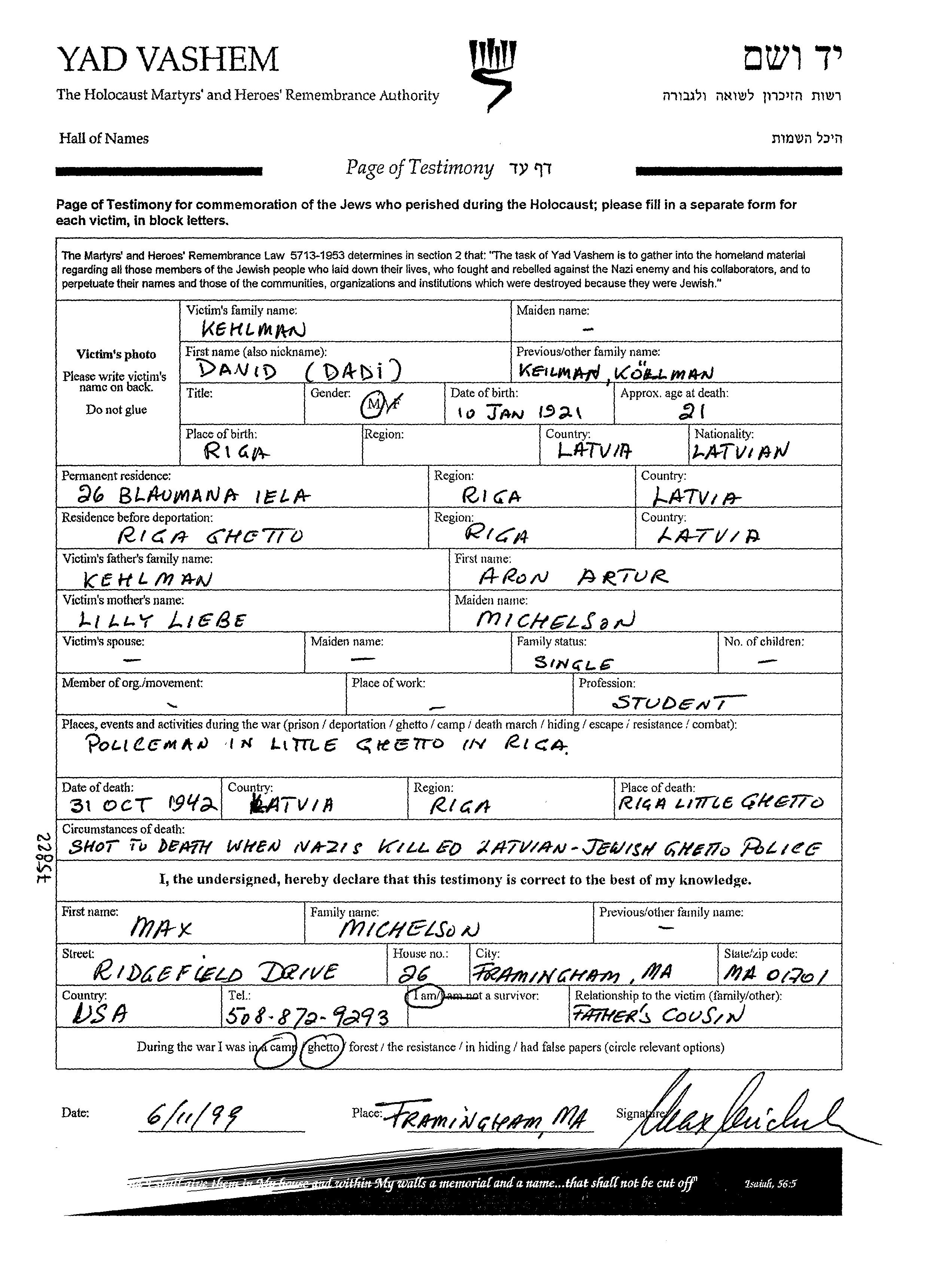 Dadi David Kehlman was born in Riga, Latvia, 1921 to Aron Artur and Lilly Liebe. He was a student and single. Prior to WWII he lived in Riga, Latvia. During the war he was in Riga, Latvia. Dadi David was murdered in the Shoah. Place of death: Riga, Latvia, 1942.