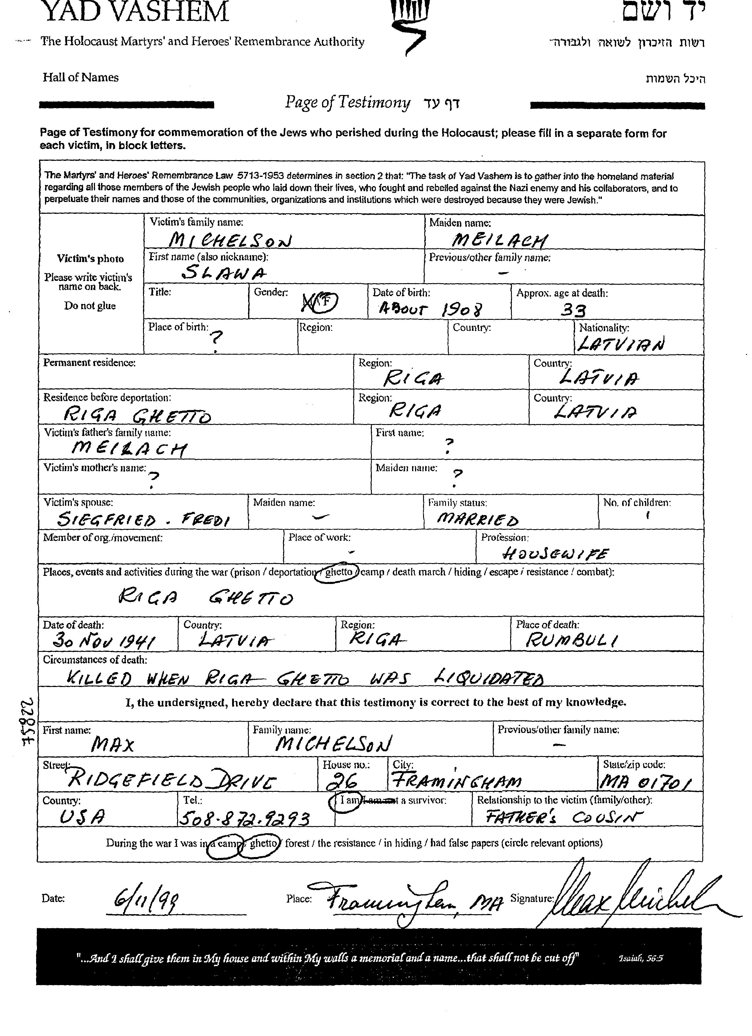 Slawa Michelson nee Meilach was born, 1908. She was a housewife and married to Fredi Siegfried. Prior to WWII she lived in Riga, Latvia. During the war she was in Riga, Latvia. Slawa was murdered in the Shoah. Place of death: Rumbuli, Latvia, 1941.