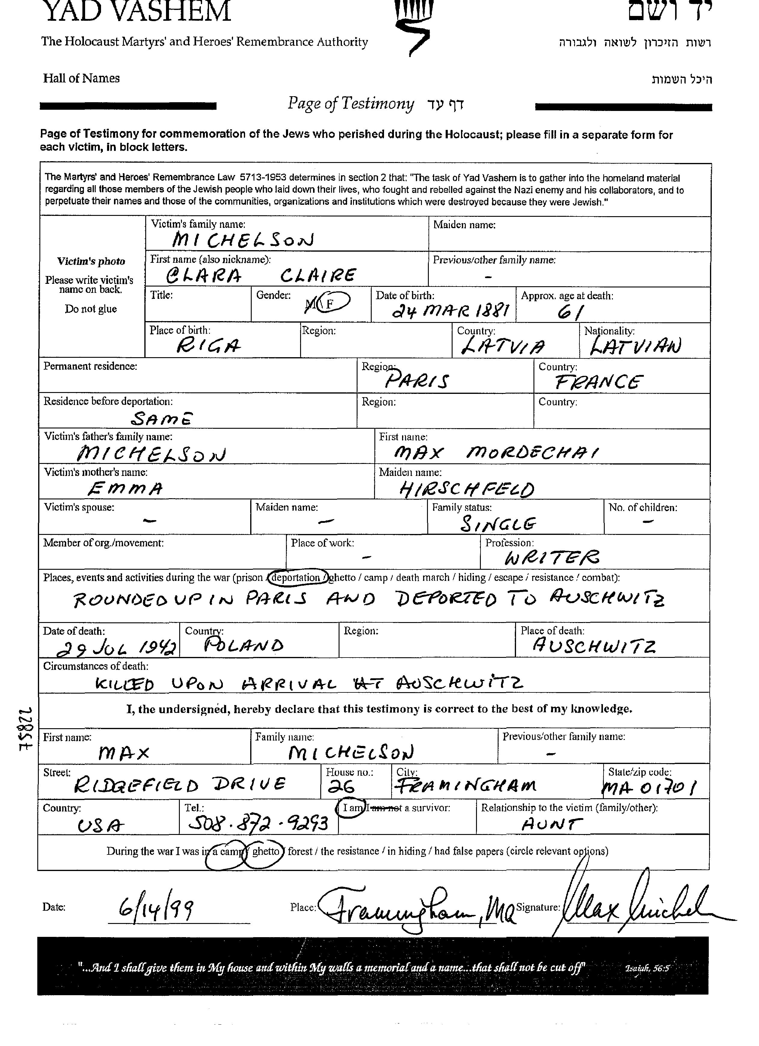Clara Michelson was born in Riga, Latvia, 1881 to Max Mordechai and Emma. She was an author and single. Prior to WWII she lived in Paris, France. During the war she was in Paris, France. Clara was murdered in the Shoah. Place of death: Auschwitz, Poland, 1942.