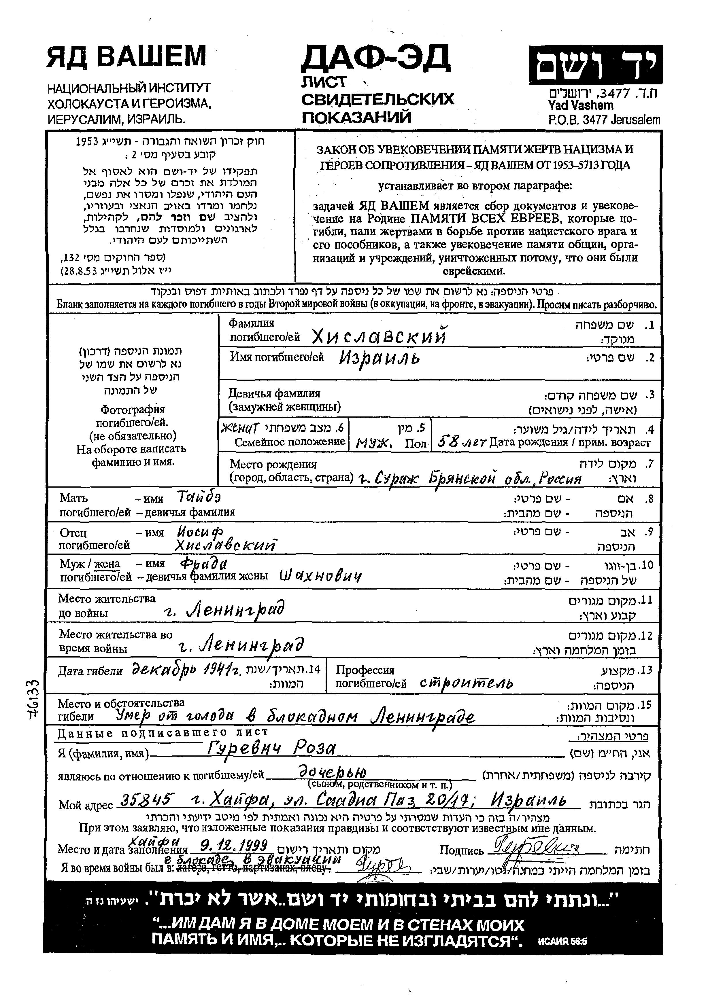 Izrail Khislavski was born in Surazh, Poland to Iosif and Taibe. He was married to Frada. Prior to WWII he lived in Leningrad, Russia (USSR). During the war he was in Leningrad, Russia (USSR). Izrail perished during the period 1933-1945 in indirect relation with the Shoah. Place of death: Leningrad, Russia (USSR), 1941.