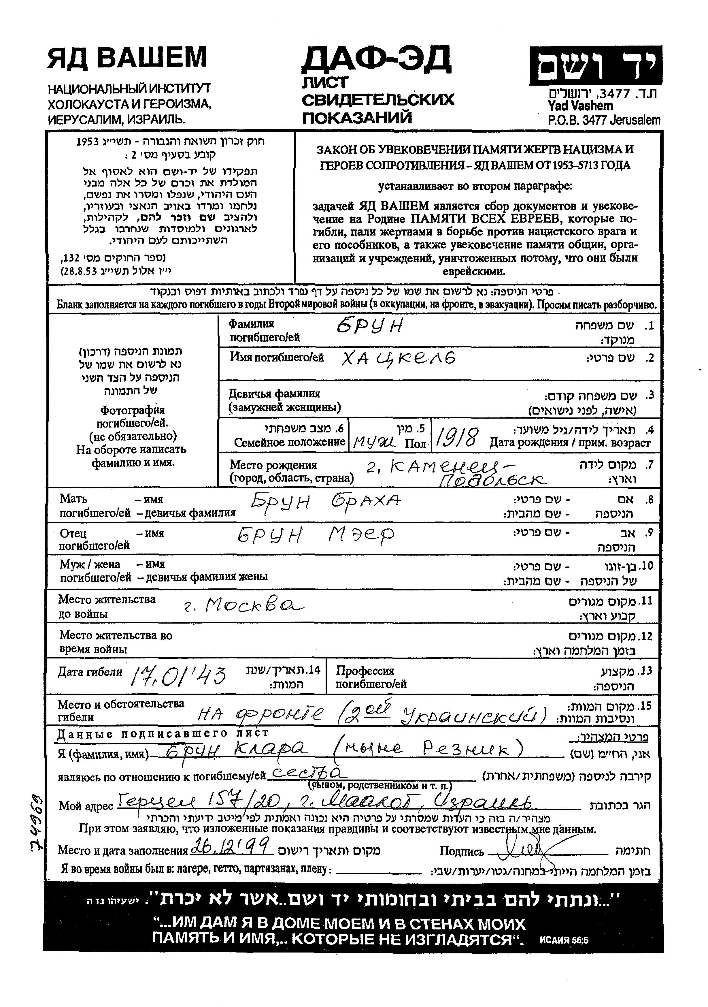 Khetzkel Brun was born in Kamenets Podolskiy, Ukraine (USSR), 1918 to Meer and Brakha. Prior to WWII he lived in Moskva, Russia (USSR). Khetzkel was killed in military service in WWII. Place of death: Ukraine (USSR), Ukraine (USSR), 1943.