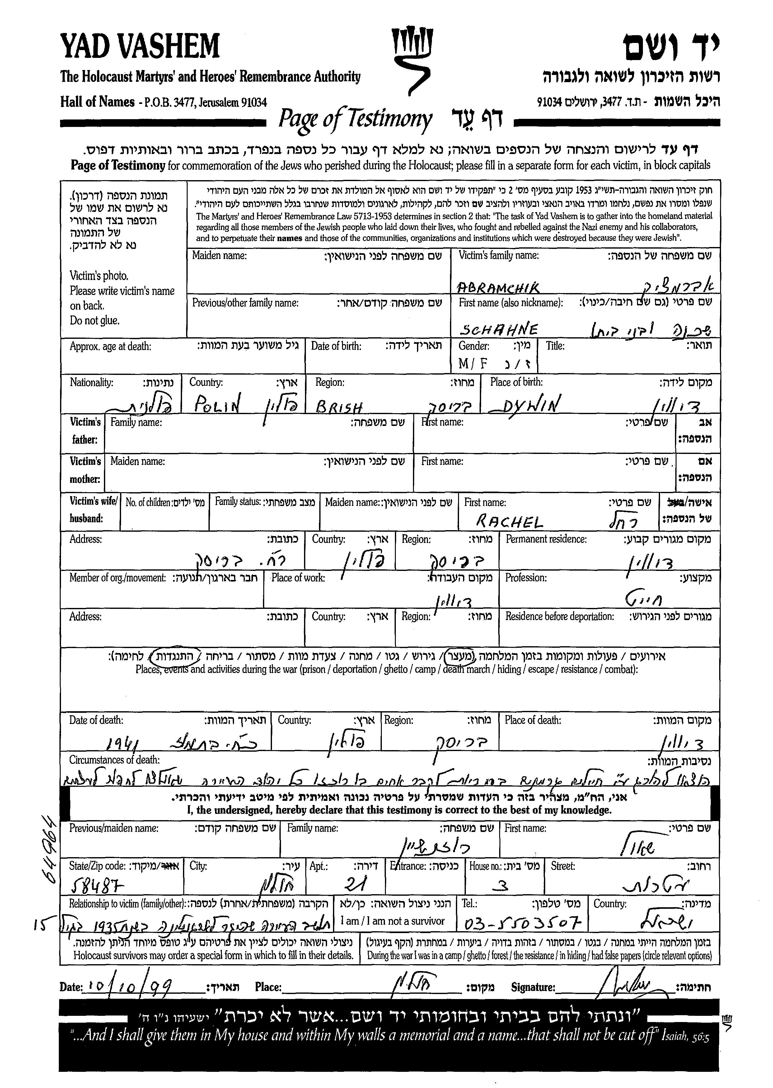 Schahne Abramchik was born in Dywin, Poland. He was a tailor and married to Rachel. Prior to WWII he lived in Dywin, Poland. Schahne was murdered in the Shoah. Place of death: Dywin, Poland, 23/07/1941.