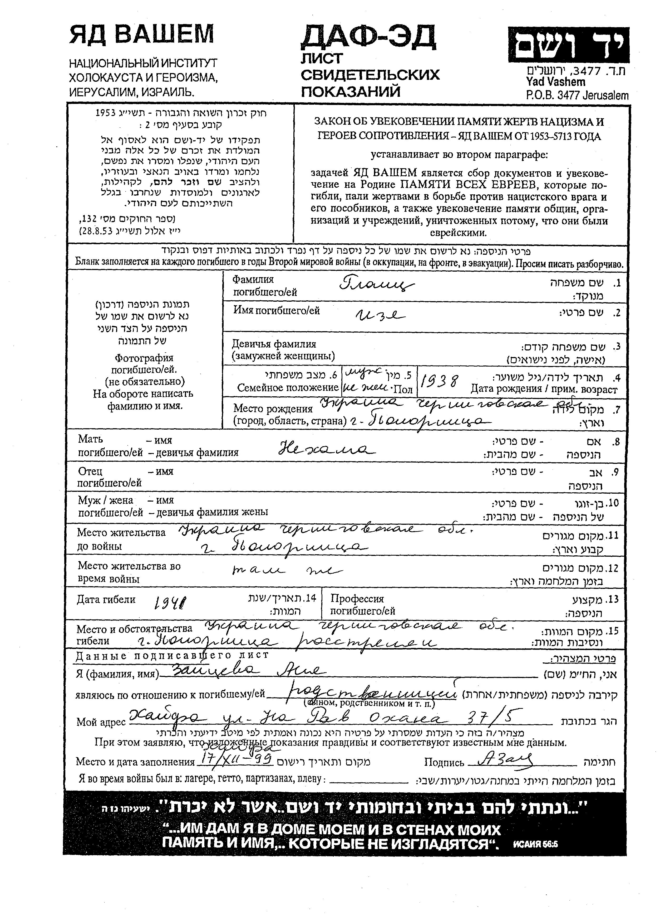 Izya Glantz was born in Ponornitsa, Ukraine (USSR), 1938 to Nekhama. He was single. Prior to WWII he lived in Ponornitsa, Ukraine (USSR). During the war he was in Ponornitsa, Ukraine (USSR). Izya was murdered in the Shoah. Place of death: Ponornitsa, Ukraine (USSR), 1941.