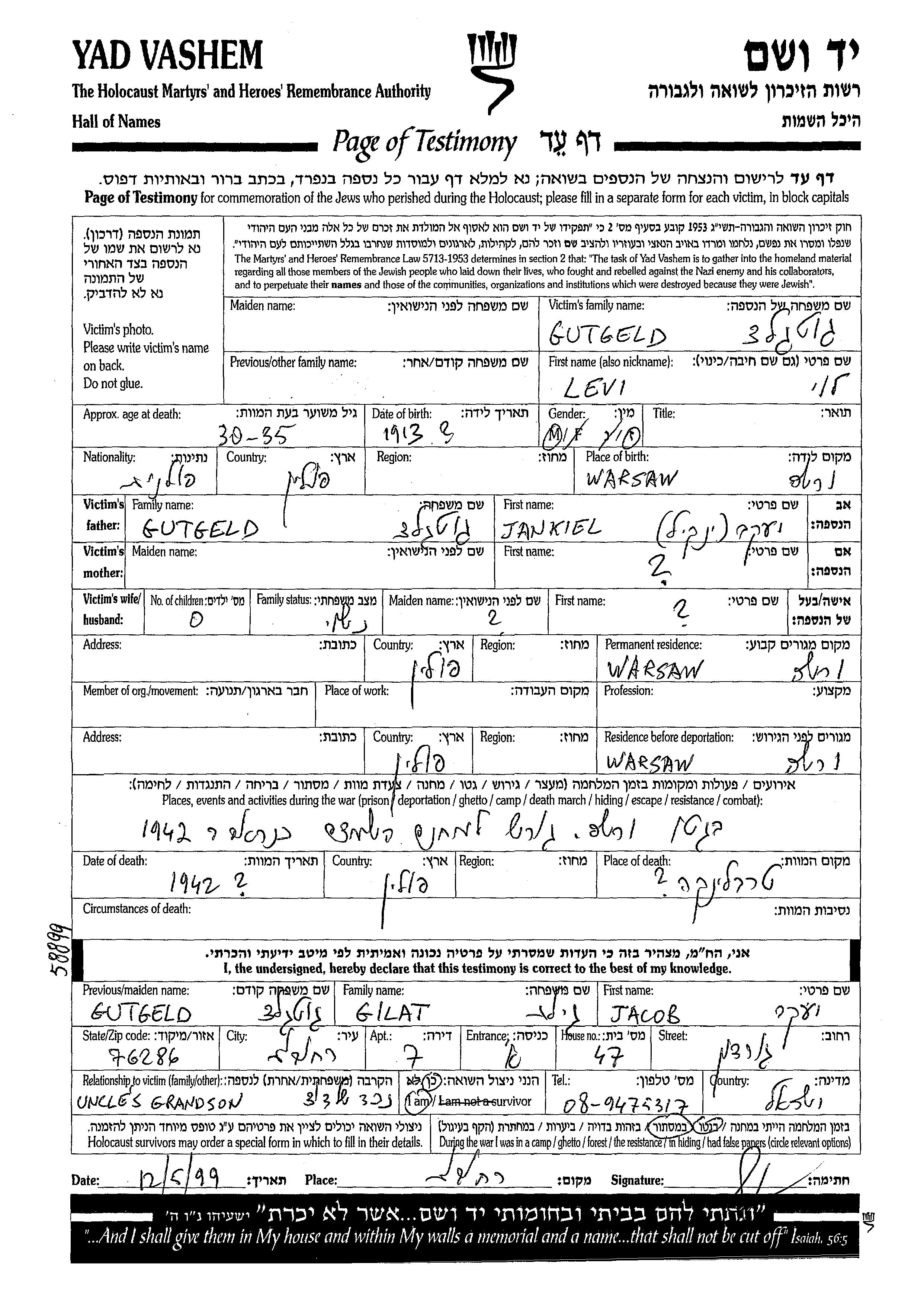 Gutgeld Levi 1913 Warszawa, Poland Page of Testimony