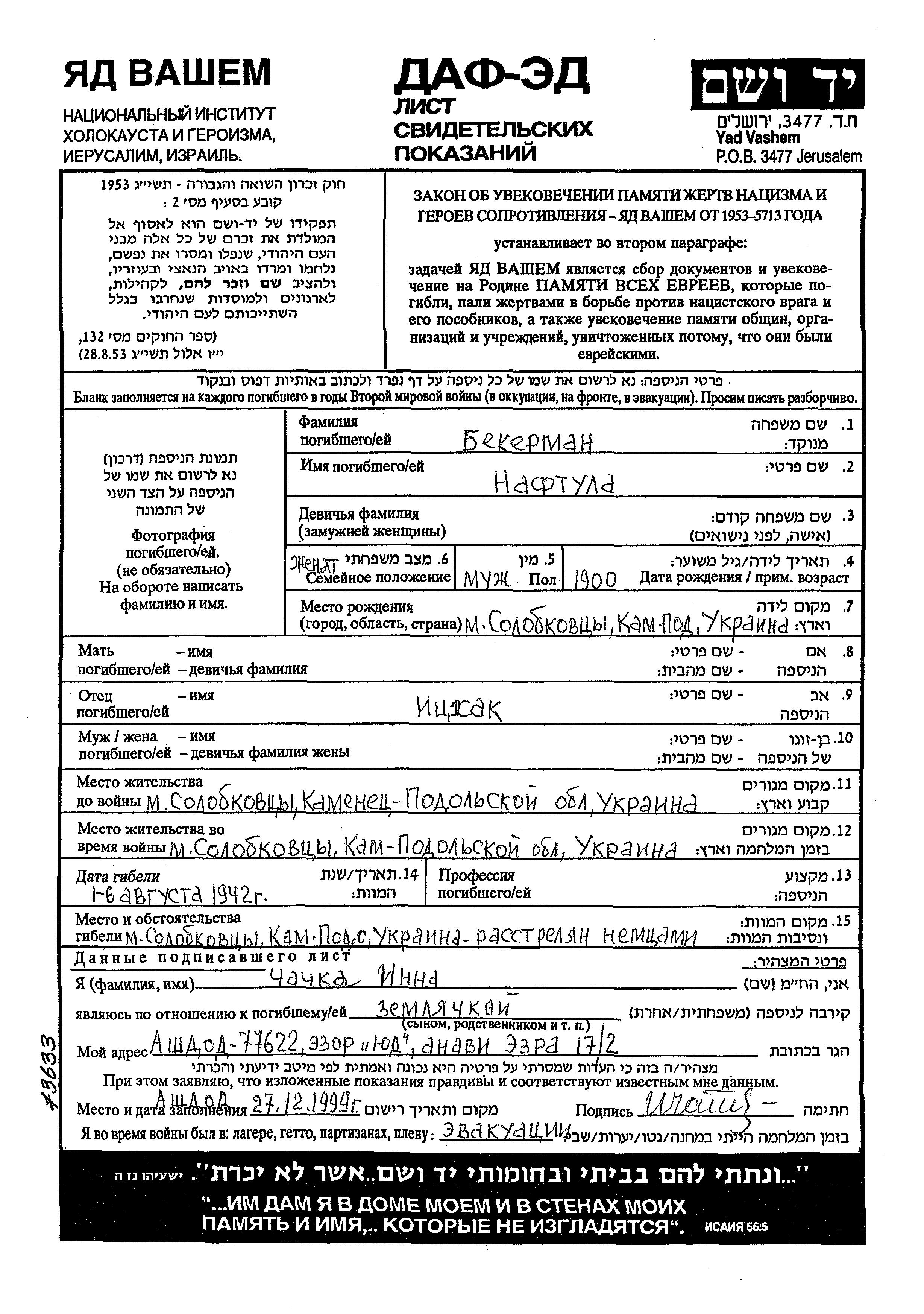 Bekerman Naftula 1900 Solobkovtsy, Ukraine (USSR) Page of Testimony