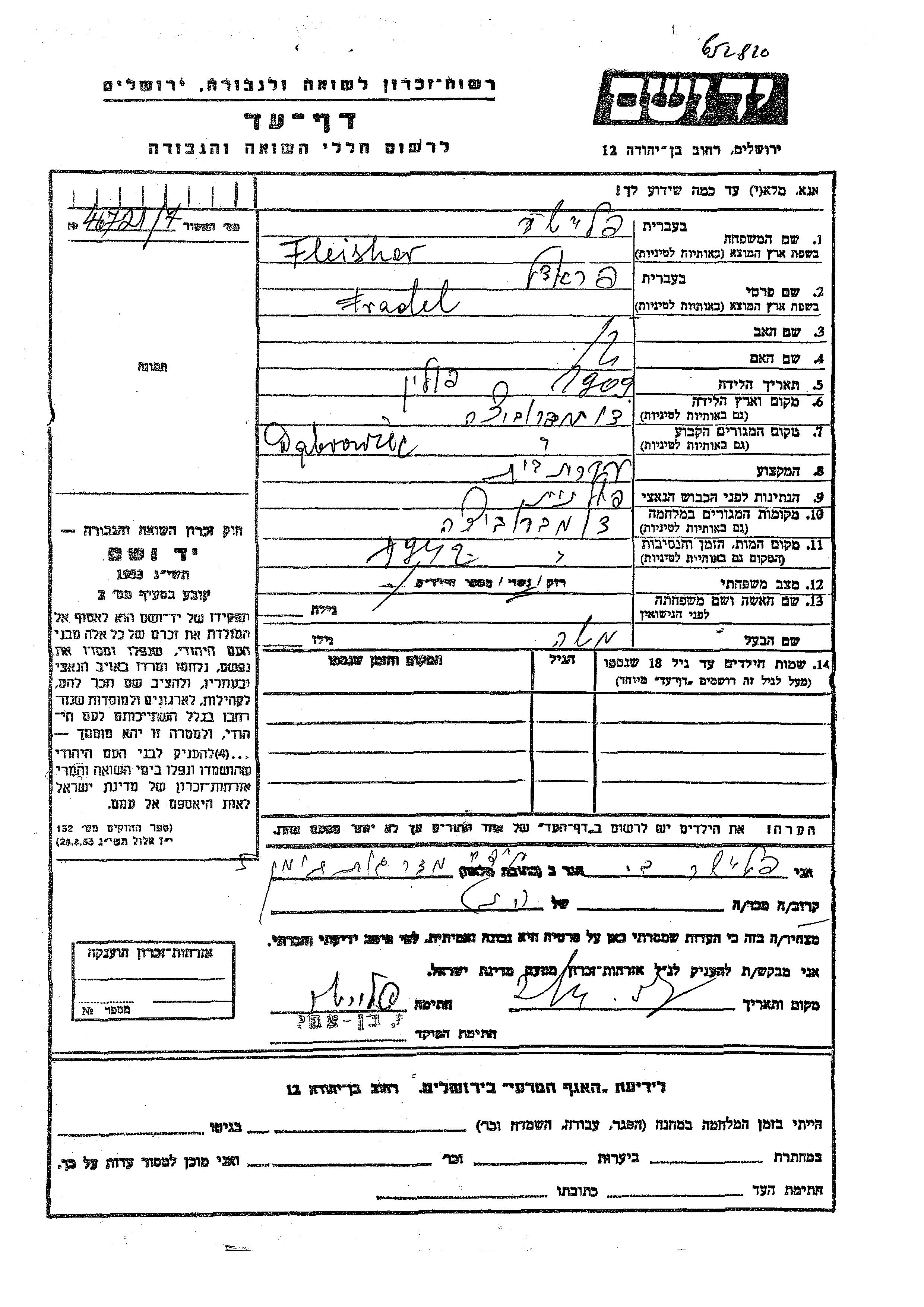 Fradel Fleisher was born in Dabrowice, Poland, 1909. She was a housewife and married to Moshe. Prior to WWII she lived in Dabrowice, Poland. During the war she was in Dabrowice, Poland. Fradel was murdered in the Shoah. Place of death: Dabrowice, Poland, 1942.